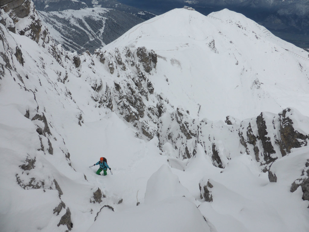 Der Urlaub in Patagonien rückt näher und daher nutzten wir den ersten Wintereinbruch um unser Equipment einem letzten Test zu unterziehen. Mit den Tourenski ging es in einer Karawane von Tourengehern über die Damenabfahrt bis zum Hoadlsattl. Von dort an begann die Stapferei zum Hochtennboden und dann hinab zum Auslauf der Hochtennspitze NW-Rinne. Selbige Rinne kann in guten Wintern eine tolle Skiabfahrt sein, derzeit wäre aber mehr Fels- als Schneekontakt für die Ski zu erwarten.