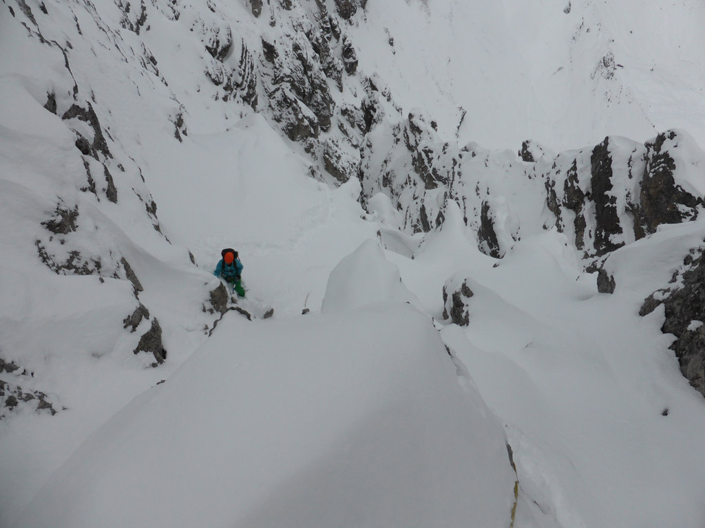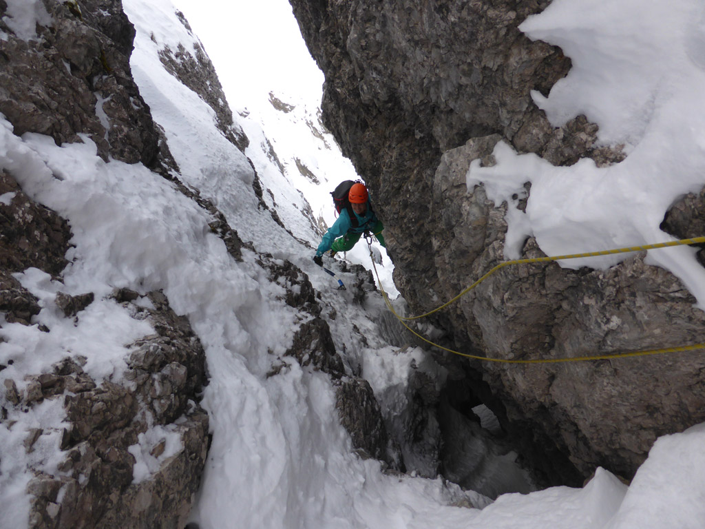 Überraschend abwechslungsreich ging es dann hinauf bis zum „Ausstiegskamin“ über den ich mich schon mehrmals für die oben genannte Skiabfahrt abgeseilt hatte. Drytooling in extrem brüchigem Fels mit Schneeauflage macht nur bedingt Spaß, aber irgendwie dann doch. Besonders schwer ist das Gelände schließlich auch nicht und man kann sogar ein, zwei Friends legen.