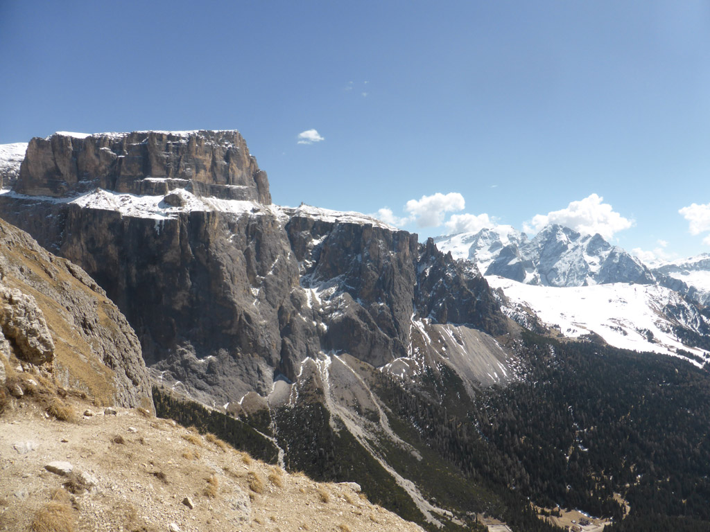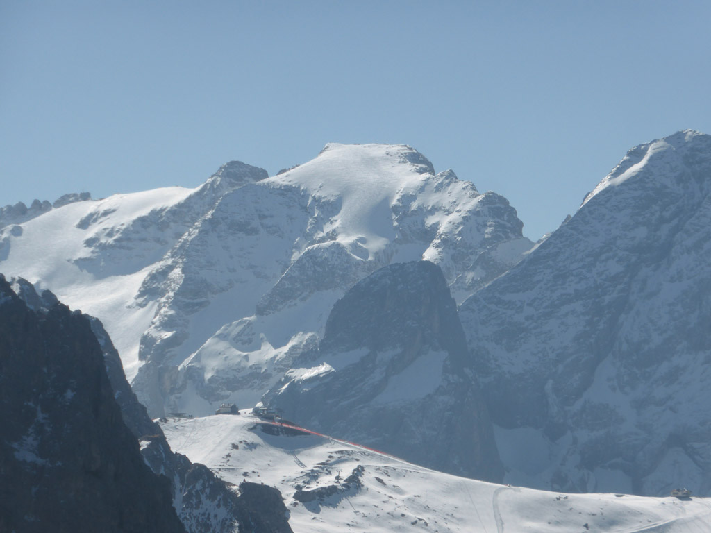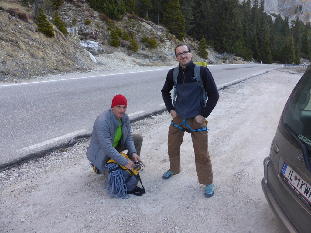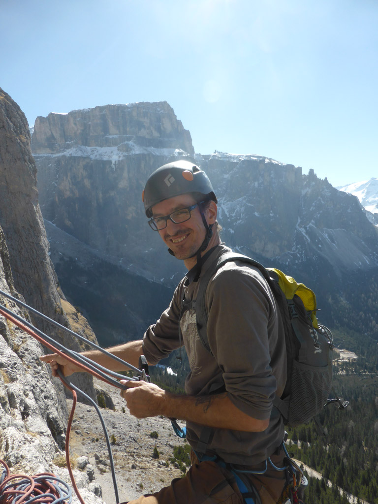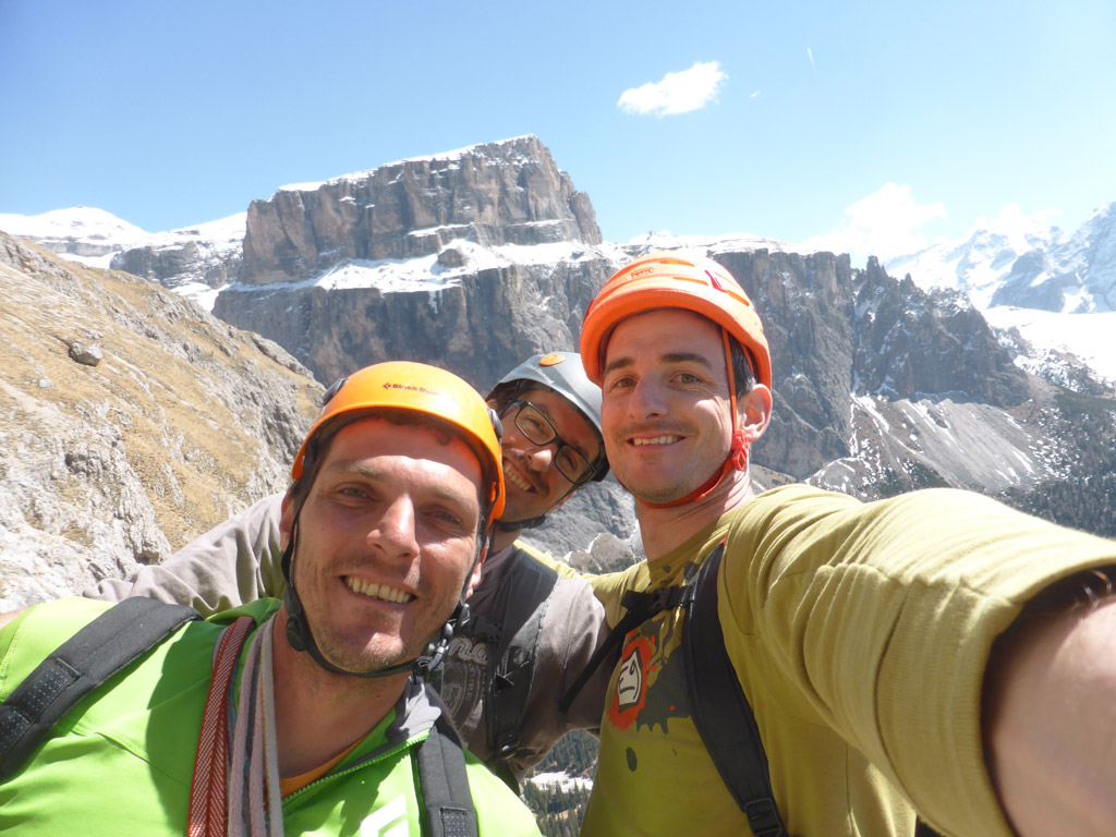 Anfang April gehen die meisten noch Skitour – Roger, Lucky und ich hatten heute aber andere Pläne. Während sich auf der gegenüber liegenden Marmolada noch zahlreiche Skifahrer tummelten, genossen wir eine noch nie dagewesene Ruhe an der Ciavazes Südwand. Nur in der Rampenführe waren noch zwei andere Seilschaften am Werken, aber die sonst so überlaufene Micheluzzi gehörte uns ganz alleine.