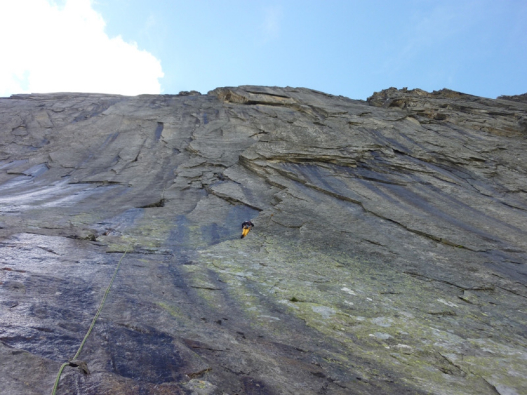 Unser Ziel war die Route „Der gestiefelte Kater“ im zentralen Wandteil. Leider hatte es am Vorabend stark geregnet und so kämpften wir uns zum Teil technisch kletternd über die nassen, rutschigen Granit-Gneis Platten. Die sogenannte „Wellenschuppe“ in der 3. Seillänge ist spektakulär, aber aus geologischer Sicht mindestens genauso beängstigend…