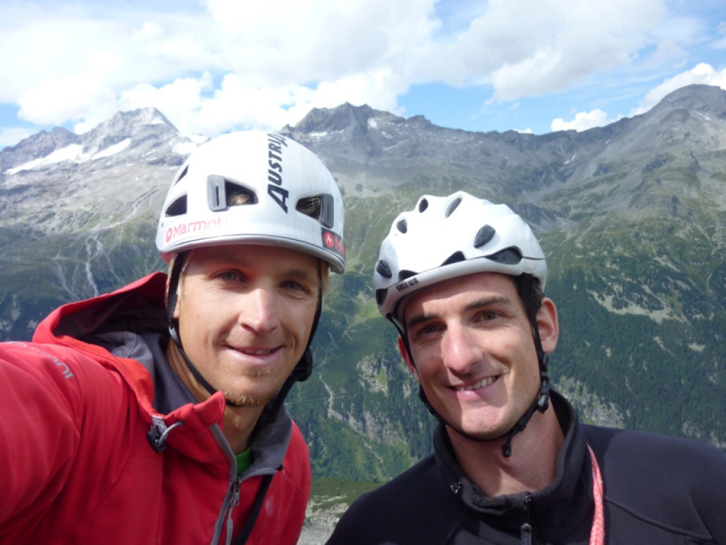 Gerade erst aus Peru zurückgekehrt, stand ich eine Woche später schon wieder auf einem Gletscher – diesmal im Jamtal im Rahmen eines Sommer-Grundkurses der Bergrettungsausbildung. Dass die Teilnehmer in meiner Gruppe top motiviert ins Ausbildungszentrum gekommen sind zeigte sich bereits zu Kursbeginn bei der Materialkontrolle. Nach einem ersten Tourentag an dem wir nach der Eisausbildung am Totenfeld Ferner auch noch auf die spektakuläre kleine Totennadel kletterten, brachen wir am nächsten Tag in Richtung Gamshorn auf. Im linken Teil der Westwand gibt es ein auffälliges Risssystem. Unser Ziel war es durch diese Schwachstelle der Wand zu klettern – und zwar als Erste! Nach zwei Seillängen in einer schönen Verschneidung erreichten wir das Risssystem, welches sich nun aus der Nähe aber als Kamin entpuppte durch den leider gar nicht wenig Wasser plätscherte. So änderten wir unseren Plan und folgten weiter rechts einer nicht weniger logischen Linie durch eine Verschneidung. In dieser Seillänge liegt die Schlüsselstelle, an der ich einen Normalhaken schlug. Nach insgesamt 4 Seillängen (besser wäre die Route aber in 6 Längen zu klettern) erreichten wir den Westgrat und somit Gehgelände. Am Gipfel einigten sich die Mitglieder meiner Gruppe auch schnell auf einen Routennahmen: Durst ist Schwäche!