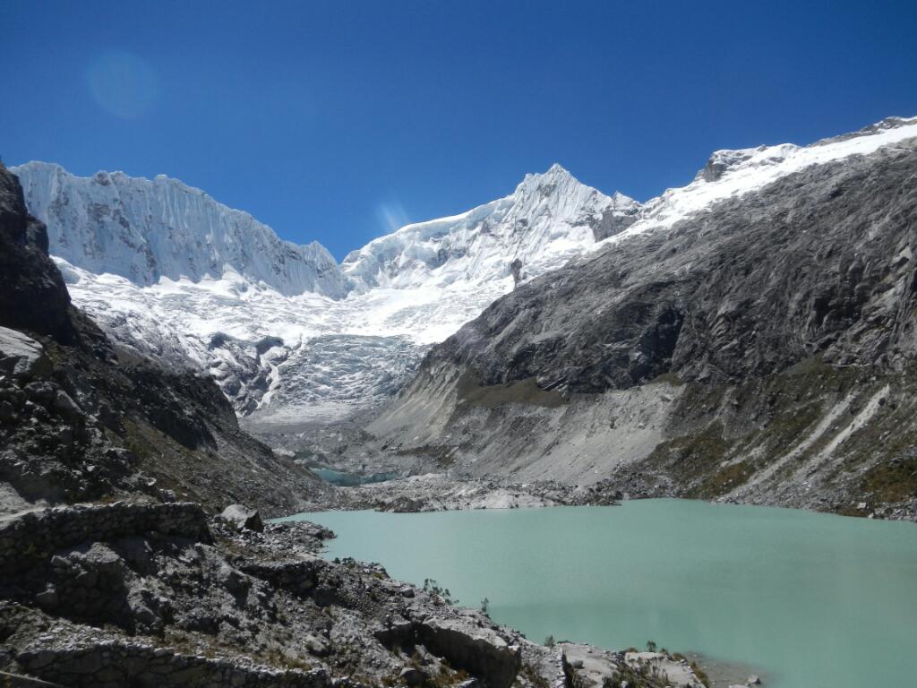 Am nächsten Morgen verzichteten wir auf die vierbeinige Unterstützung und kofferten unser Gepäck selbst ins Tal. Erstaunlich motiviert brachen wir Mittags dann gleich wieder zur nächsten Tour auf. Unser Ziel war die berühmte Laguna 69, welche ebenfalls auf 4600 m liegt und beeindruckende Blicke auf die wilden Nevados Chacraraju bietet. Am Rückweg konnte sich Klaus ein erfrischendes Bad in einem Gletschersee nicht verkneifen (ebenfalls Beweisfotos vorhanden).