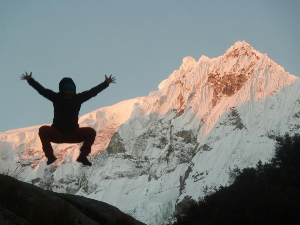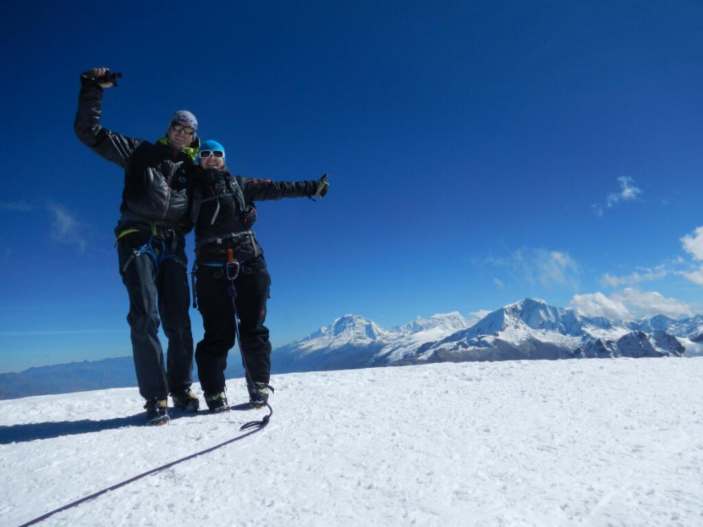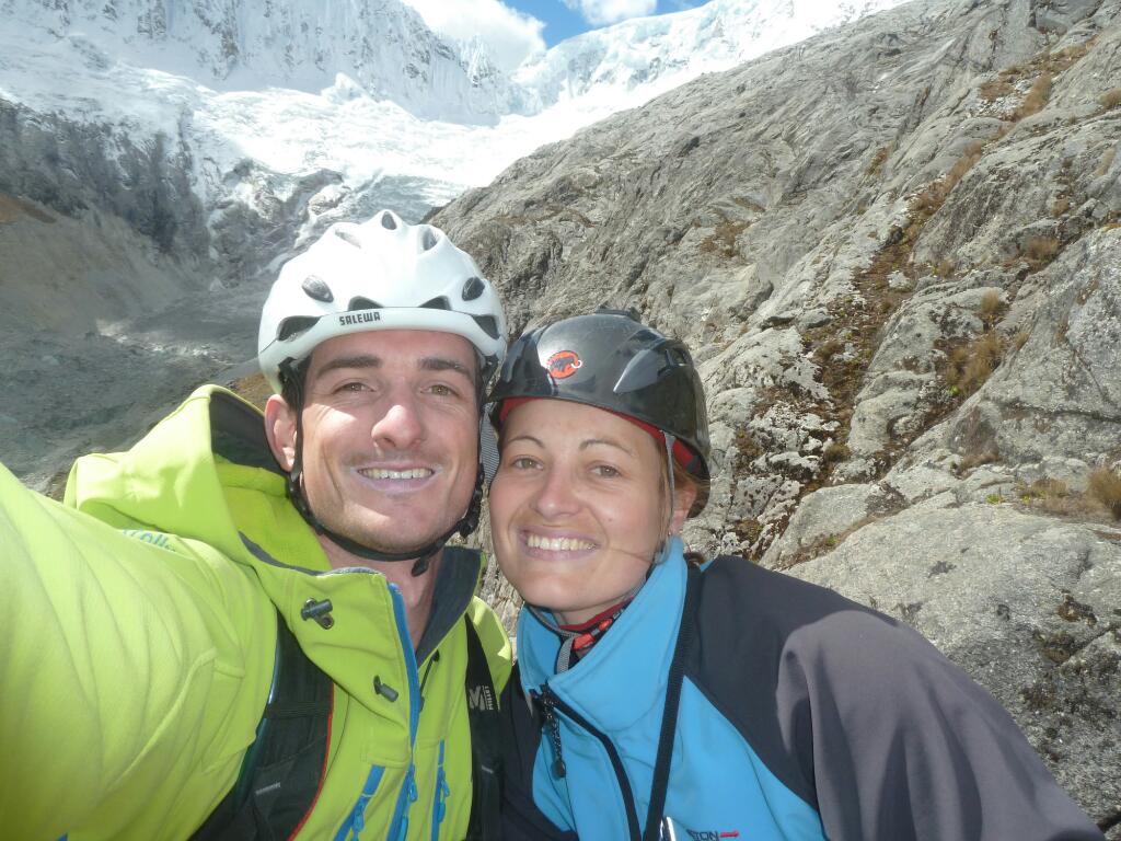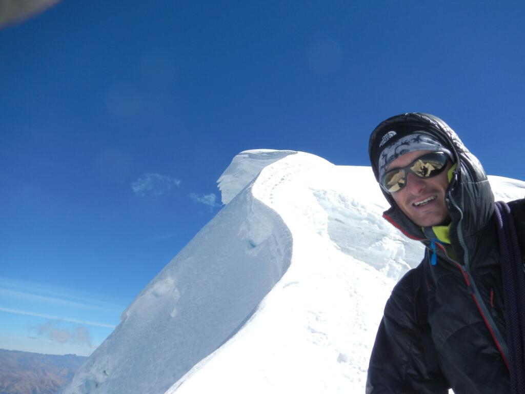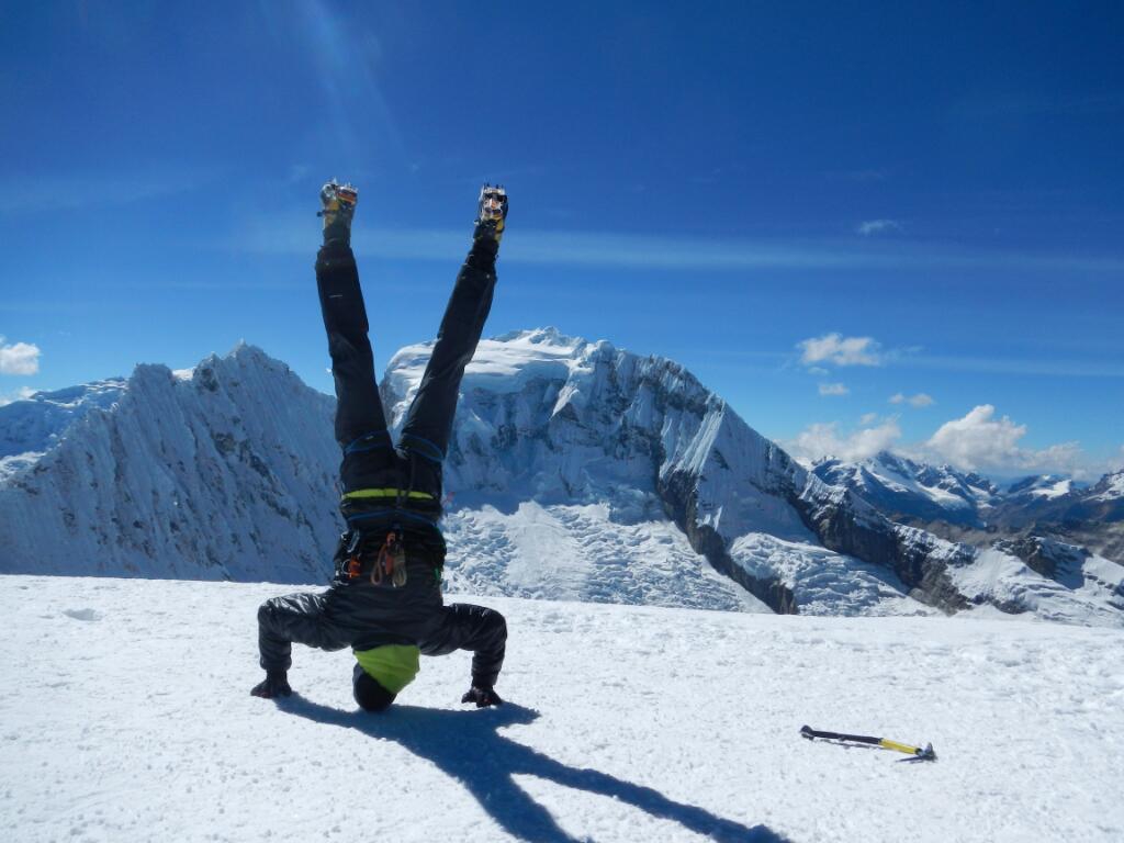 Claudia und ich konnten dieses Panorama nun auch schon deutlich mehr genießen, da wir mittlerweile viel besser akklimatisiert waren, als am Vallunaraju. Nach weniger als sieben Stunden kletterten wir als kleine Zugabe über die sehr steile Variante auf den Gipfel, auf den sich Claudia nach einem Zielsprint stürzte (Beweisvideo vorhanden).