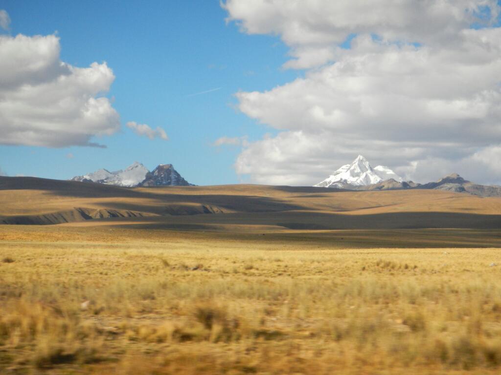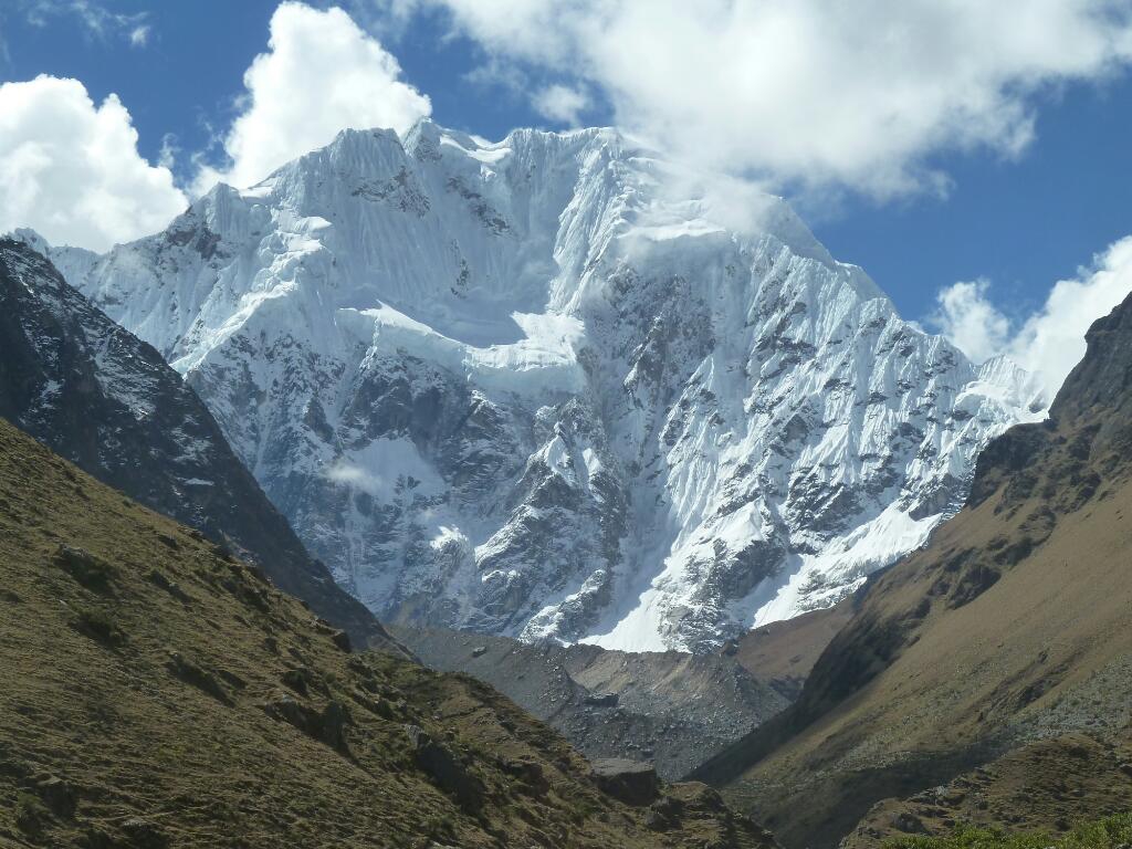In der Nacht regnete es ein bisschen und auch am Morgen hingen die Wolken noch bis tief ins Tal herab. Ein paar Meter nach unserem Zeltplatz erreichten wir um 7 Uhr die neue Fahrstraße, die scheinbar doch intakt ist, denn bald fuhren die ersten Lieferautos an uns vorbei. Transportmittel der ersten Wahl ist aber doch das Pferd, über den ganzen Tag gerechnet begegneten oder überholten uns bestimmt hundert schwer bepackte Vierbeiner. Gleich nach der kleinen Siedlung Collpapampa, in der wir uns noch mit Keksen und noch mehr Schokoriegeln eindeckten, verließen wir die Fahrstraße und überquerten eine Hängebrücke Richtung Salkantay Pass. Von nun an gewinnt man schnell Höhenmeter, denn der schmale Pfad ist ziemlich steil. Mehrmals erkundigten sich Einheimische und Touristen, ob wir schon in die richtige Richtung marschieren, schließlich liege Machu Picchu in der Gegenrichtung… Die Wolkendecke riss untertags nur selten auf und erlaubte nur kurze Blicke auf die beeindruckende Bergwelt. In einer Seehöhe von ca. 3900 m erreichten wir die Baumgrenze. Die folgenden Almwiesen samt Kühen erinnern an unsere Almen – aber um ganze 1000 m höher. Auf ungefähr 4000 m liegt ein großer Lagerplatz, an dem die geführten Reisegruppen bekocht werden. Wir aber stiegen noch weiter auf, vorbei an Alpacas, bis in eine Höhe von 4280 m, mit dementsprechend dünner Luft. Hier fanden wir um 3 Uhr einen netten Zeltplatz, abseits der restlichen Salkantay-Treker. Pünktlich zu unserer ersten Kanne Kokatee riss auch die Wolkendecke auf und wir hatten freie Sicht auf den nun sehr nahen Salkantay. Beide Talseiten beeindrucken mit mächtigen Hängegletschern und den typischen Riffelwänden aus senkrecht angepresstem Schnee. Noch bevor es ganz dunkel und somit auch gleich ziemlich kalt wurde zogen wir in unser Zelt ein. Sozusagen als Einschlaflied lauschen wir gespannt dem tiefen Grollen herabbrechender Eismassen. Tagesbilanz: 14 km und über 1500 Höhenmeter.