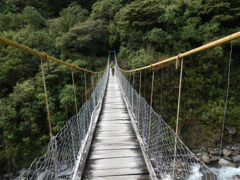 Heute war ein langer, anstrengende Tag, aber nun der Reihe nach: Nachdem wir unser Trinkfrühstück (Schoko-Peronin) in der Arena der Inkaschauplätze beendet hatten brachen wir um 7 Uhr auf. Nach etwa 20 Minuten erreichten wir den Pass zwischen Aobambatal und jenem des Rio Santa Teresa auf ca. 2800 m. Von nun an ging es entlang eines perfekt angelegten und gepflegten Inkapfades bergab. Anfangs durch einen wegen der vielen Schlingpflanzen mystisch wirkenden Wald, später durch etliche Bananen-, Kaffee-, und Avocadoplantagen. Bald erreichten wir die staubige Fahrstraße, welche die vielen kleinen Siedlungen und Wellblechhütten mit der Ausenwelt verbindet. Das Angebot eines Taxifahrers uns bis zum nächsten größeren Dorf mitzunehmen lehnten wir im sportlichen Ehrgeiz dankend ab. Um 10 Uhr kamen wir in Sahuayaco an, wo wir uns mit frittiertem Huhn und viel Inka Cola stärkten. Ab nun ging es wieder kontinuierlich bergauf, wobei sich der Fahrweg bald zu einem schmalen Gehweg verengte. Auf der anderen Talseite gäbe es seit ein paar Jahren eine Straße, jedoch dürfte diese wegen zahlreicher Muren derzeit unbefahrbar sein. Auch unser Pfad ist immer wieder über kurze Strecken vermurt, wackelige Holzbrücken ermöglichen aber ein rasches Weiterkommen. Die steilen Talflanken weisen nur selten ebene Flächen auf und diese werden dann für kleine Plantagen genützt. Mehrmals gelang man so auch zu „Campingplätzen“, an denen sich die Bauern durch den Verkauf von überteuerten Erfrischungsgetränken und Schokoriegeln etwas dazuverdienen. Hier trifft man meist auch auf organisierte Touristengruppen, deren Gepäck mit Pferden oder Eselkolonnen transportiert wird. Ein übermäßig hilfsbereiter Amerikaner erklärte uns, dass unser für heute angestrebtes Etappenziel noch 5 Stunden entfernt sei… (es waren dann nicht einmal 3). Der Pfad verläuft nun leider nicht mehr ganz so kontinuierlich was den Höhenmetergewinn betrifft, denn es müssen oft kleine Felswände und Murgräben umgangen werden. Plötzlich fallen einem kleine Quellen auf, an denen das Gestein intensiv rot gefärbt ist. An einer Stelle spritzt das Wasser etwa 5 m im hohen Bogen aus einem Felsspalt heraus. Ein Kontrollgriff bestätigte die Vermutung, dass es sich dabei um warme Quellen handelt. Nur wenige Meter weiter mündet ein großer Bach in den Rio Santa Teresa. Hier schlugen wir an einem kleinen, ebenen Platz unser Lager auf. Ein kurzes Bad im kalten Wasser und ein gutes Kilo Nudeln später verkrochen wir uns beim Einsetzen des Regens in unser Zelt. Tagesbilanz: 22 km und fast 900 Höhenmeter.