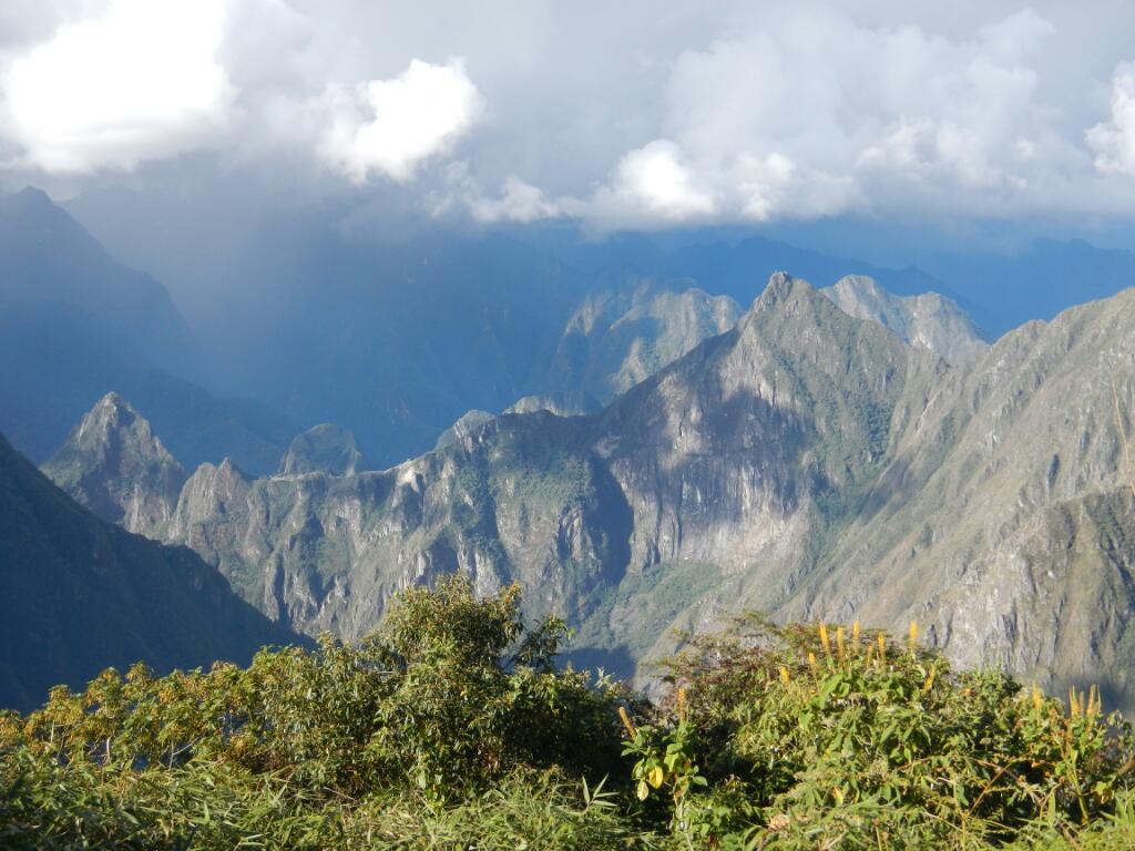 Heute brachen wir um 6 Uhr bei leichtem Regen von Aguas Calientes Richtung Hidro Electrico auf. Unsere Rucksäcke wiegen gefühlte 100 Kilo, doch nach 2,5 Stunden hatten wir die 11 km entlang der Schienen geschafft. Neidisch machten wir dem ersten Zug der uns überholte Platz, doch dieser Abschnitt der Bahnstrecke darf nur von Einheimischen befahren werden(!). Am Bahnhof des alten Wasserkraftwerkes stärkten wir uns an einem kleinen Imbissstand, ehe wir nach Süden in das Aobamba Tal abbogen und die Zivilisation hinter uns ließen. Nun beginnt das Abenteuer Salkantay Trek! Ein junger Hund entschloss sich uns zu begleiten und wehrte unsere Verscheuchungsversuche gleichgültig ab. Bald gelangt man zu einer 50 m langen Hängebrücke, die uns wild schaukelnd zur anderen Talseite führte. Hier filtrierten wir 5 Liter Trinkwasser (bedeutet nochmals 5 kg mehr zu tragen) und begannen dann mit dem steilen Aufstieg. Der schmale, schlammige Pfad führt mit unzähligen Serpentinen durch den Regenwald mit Bananenbäumen, Kokastauden und Walderdbeeren. Mmmmmhh! Bald kamen uns die ersten Touristen entgegen, schließlich wird diese Trekkingtour normalerweise von der Gegenrichtung gemacht. „Unser“ Hund schien von unserer unfreundlichen Art ihm gegenüber nun doch die „Schnauze voll zu haben“ und schloss sich zwei Franzosen an! Um 13 Uhr erreichten wir nach fast 900 Höhenmetern die Inkaruinen von Llactapata. Von hier hat man einen wunderschönen Ausblick nach Machu Picchu und auch der über 6000 m hohe Salkantay lässt sich zwischen den Wolken erkennen. In nun völliger Einsamkeit machten wir es uns auf der Wiese zwischen den Ruinen bequem, und genossen unsere Travellunch Ration. Nachdem ich diese Zeilen fertig getippt habe werden wir uns noch gemütlich einen Kokatee machen während wir den Sonnenuntergang über Machu Picchu bewundern und uns schließlich in unser Zelt innerhalb der Mauern eines Inka Hauses kuscheln. Ja – es geht uns richtig gut! 🙂