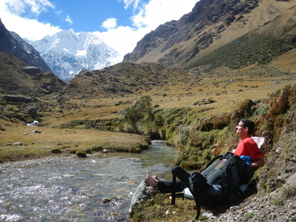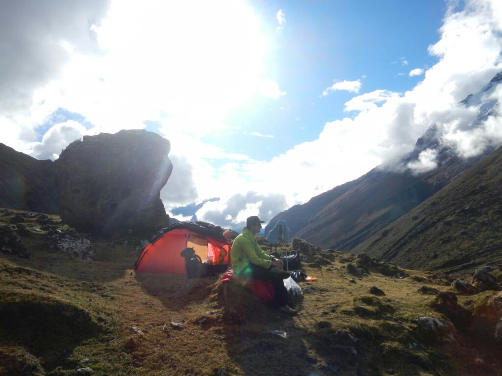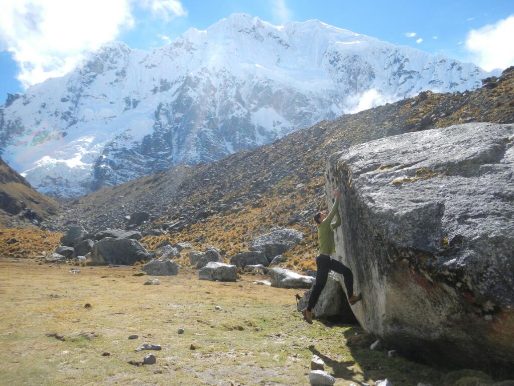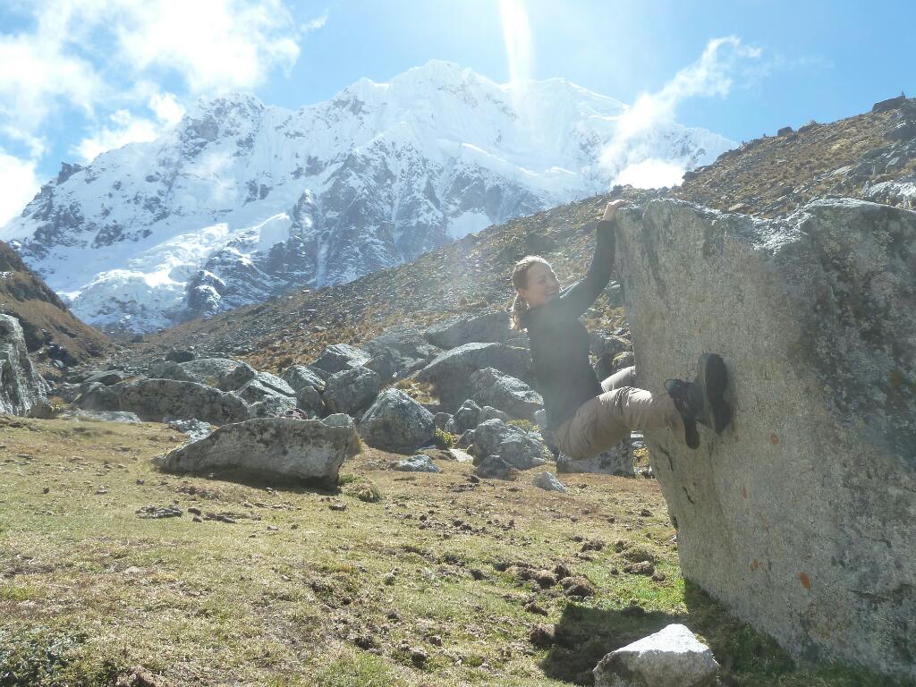 Da uns die höhenbedingten Kopfschmerzen ein bisschen Schlaf raubten ließen wir den Wecker heute ein wenig später läuten. Außerdem motiviert einen die Kälte (das Außenzelt war vereist) auch nicht gerade für einen frühen Aufbruch… Doch als wir uns dann doch überwunden hatte den warmen Schlafsack zu verlassen um heißen Kokatee zu kochen wurden wir mit einem fast wolkenlosem Bergpanorama belohnt! Heute vertrugen wir die Höhe schon um vieles besser als gestern abend und so erreichten wir schon nach ca. Einer dreiviertel Stunde den 4620 m hohen Pass. Der Ausblick hinüber zu 2000 m hohen, furchteinflößenden Südwand des Salkantays war einfach unbeschreiblich! Wir freuten uns über das große Glück des richtigen Timings, denn gestern dürfte diese Bergkulisse wohl die meiste Zeit hinter den Wolken verborgen geblieben sein. Sobald die Sonne nur ein wenig über dem Salkantay-Gipfel hervorkam wurde es schnell angenehm warm. So konnten wir hier oben den sprichwörtlich, wie auch tatsächlichen Höhepunkt unseres Trekkings genießen. Unterhalb der steilen Südwand setzt ein riesiger Moränenwall an, den wir natürlich auch noch besteigen mussten. Hier und auf einer nahen Almwiese fanden wir dann mehrere exzellente Boulderblöcke und wir verbrachten mindestens eine Stunde damit ein paar Probleme zu knacken. Unglaublich wie einem die dünne Luft beim schweren Klettern zu schaffen macht! Das erste Mal in den vergangenen Tagen waren nun wir es, die bergab gingen, während sich die geführten Touristengruppen nach oben keuchten. Mittlerweile glauben wir, dass wir die ersten überhaupt sind, die den Salkantay Trek in diese Richtung machen. Kurz vor Soraypampa gönnten wir uns auf 4000 m und strahlendem Sonnenschein ein äußerst erfrischendes Bad in einem Bach. Von nun an folgt man einer nur sehr mäßig abfallenden Schotterstraße hinaus nach Molepata. Nachdem wir uns noch ein Travellunch-Mittagessen zubereiteten waren wir sehr froh, als uns ein sogenannter „Colletivo“ also ein Kleinbus überholte. Als wir erfuhren, dass dieser direkt nach Cuzco fährt zögerten wir natürlich nicht lange und ersparten uns so fast 18 km an eher eintönigem Bergabgehen. Unsere Gelenke waren uns sicher dankbar! In der Dunkelheit kamen wir gegen 7 trotz haarsträubender Fahrweise sicher in der Inkahauptstadt an und waren froh im selben Hotel wie vor einer Woche ein Zimmer zu bekommen. Trotz der deutlich anstrengenderen Variante (fast 5000 Höhenmeter auf ca. 80 km Wegstrecke, alles ohne Träger) hatten wir den Salkantay Trek nun doch wie alle anderen auch in 4 Tagen geschafft. So bleibt uns ein Tag mehr in Cuzco zum Wäsche waschen und für ein wenig sightseeing. Am 29. fliegen wir zurück nach Lima, ehe wir am darauffolgenden Tag mit dem Bus nach Huaraz in Richtung nächster Bergabenteuer aufbrechen werden.