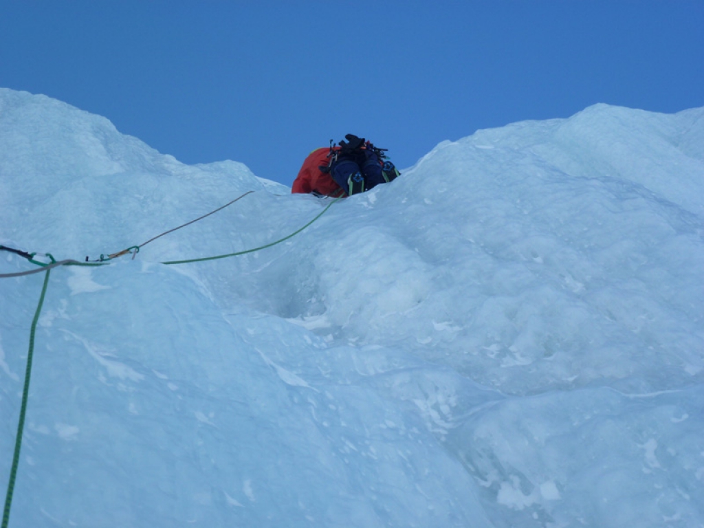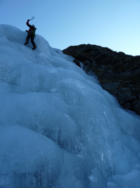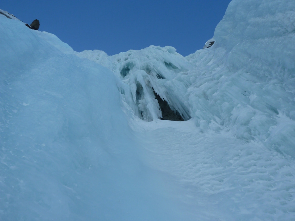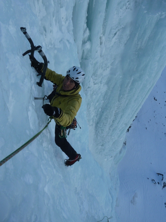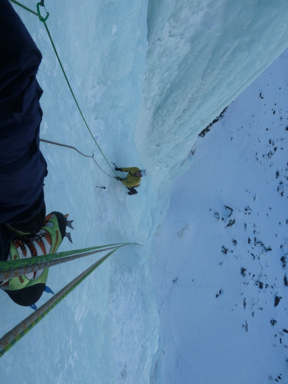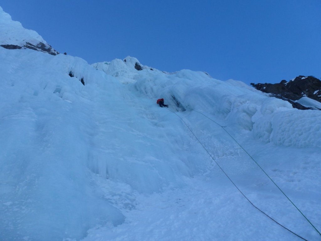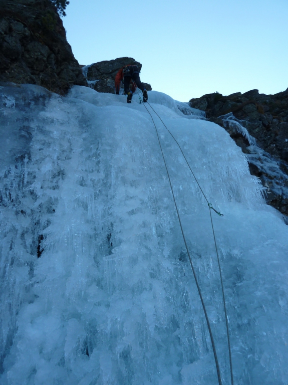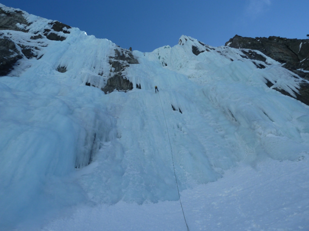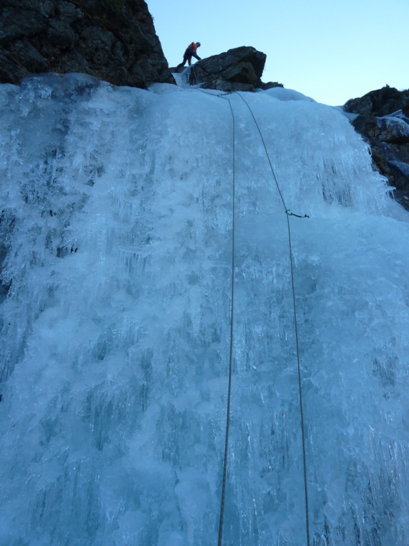 Im Mittelteil erfreute uns Soft-Ice vom Feinsten, der Rest ist komplett trocken und perfekt zu klettern. Vom Bohrhaken am Ausstieg gelangt man mit drei Abseiler zum Boden – die Eissanduhren waren alle vorhanden. Die schwereren Linien, wie z.B. Teufelskralle sehen nicht mehr allzu vertrauenserweckend aus.