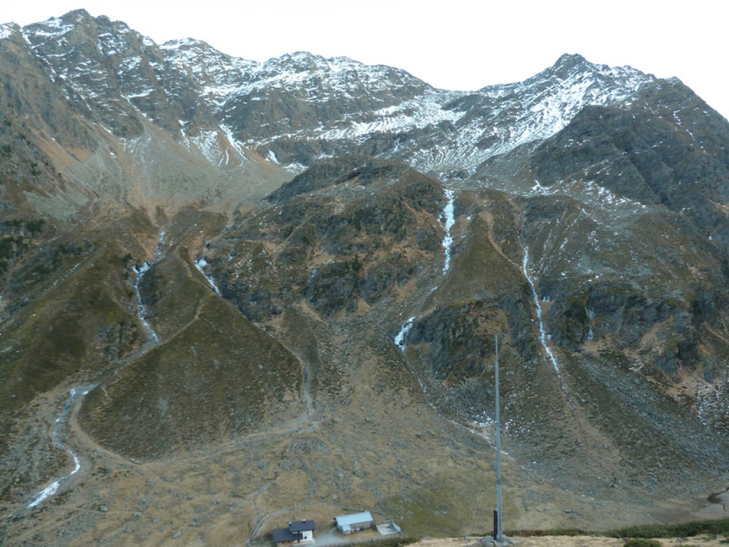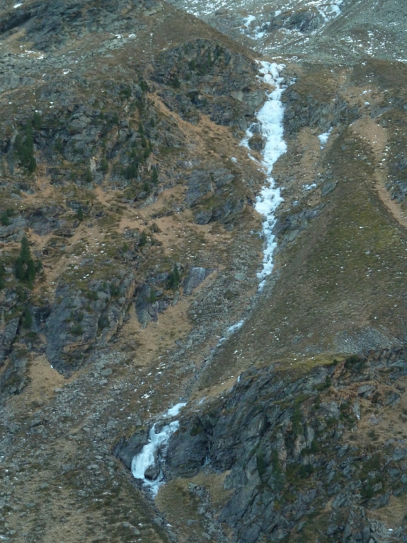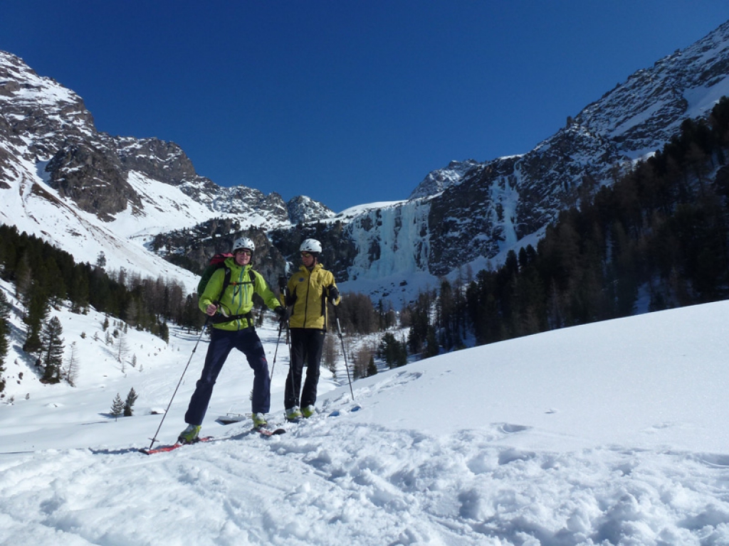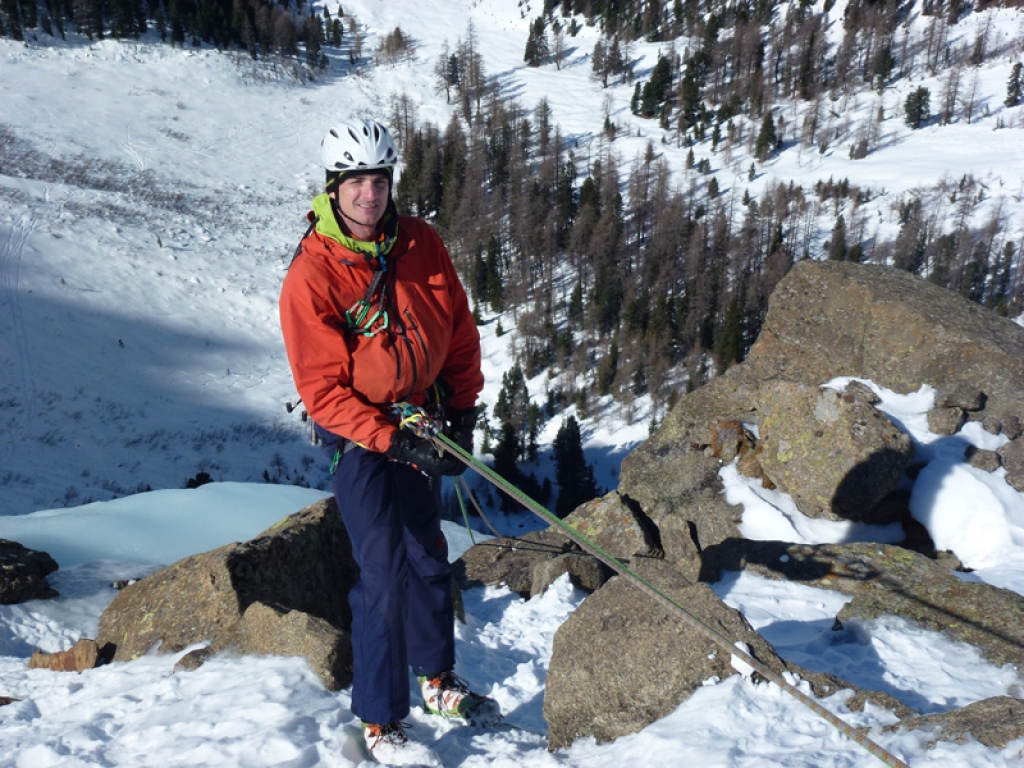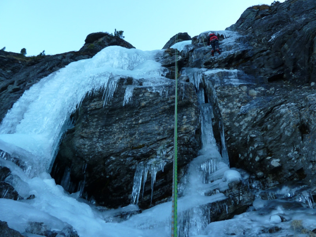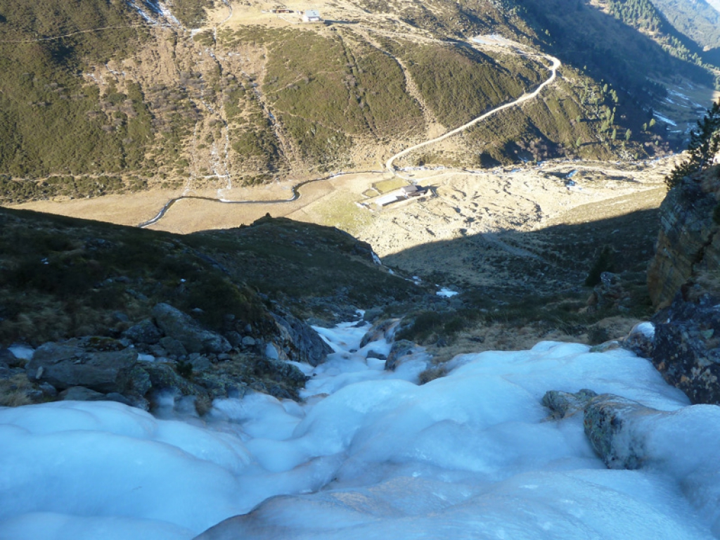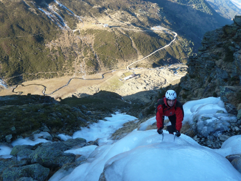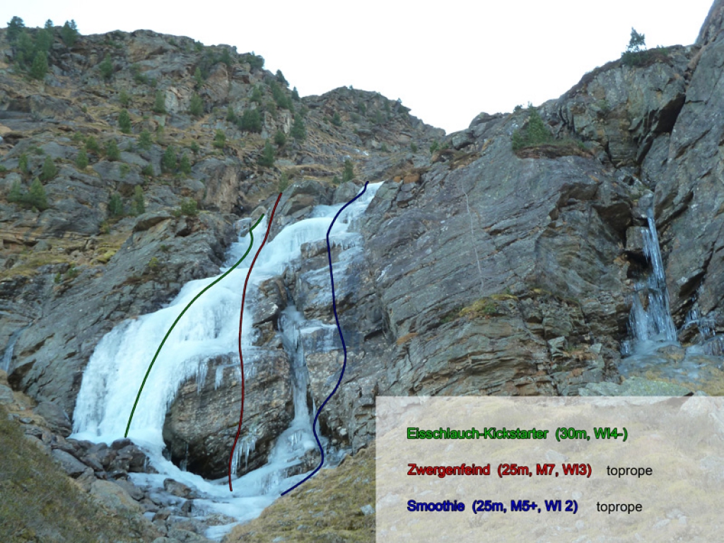 Eisklettern in der Fotsch!? Wer hätte das für möglich gehalten? Das Fotschertal ist für Freunde des Vertikalen eigentlich kein sehr attraktiver Ort, doch das sonderbare Wetter der letzten Wochen zauberte eine kleine Überraschung hervor: Oberhalb der Seealm verwandelte sich ein kleines Rinnsaal in einen ca 250m langen Eisschlauch, selten breiter als fünf Meter, und beidseitig von Bergwiese begrenzt. Ganz unten erwartet den erstaunten Eiskletterer eine 30 Meter hohe Steilstufe, die fortan den Namen „Potsdamer Eisgarten“ tragen soll. Neben der leichtesten Linie, dem „Kickstarter“ erfreuen ganz besonders ein paar Mixed-Linien, von denen heute nur der „Zwergenfeind“ und der „Smoothie“ geklettert wurden. Beide leider nur toprope,da sie nicht absicherbar sind, aber vielleicht findet ja einmal jemand Zeit ein paar Haken anzubringen.