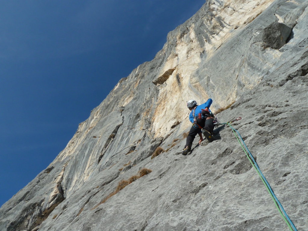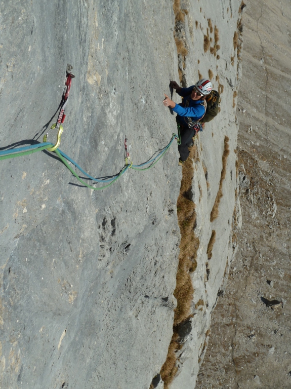 – Die Route kreuzt hin und wieder die „Alte Südwand“, die viel leichter ist. (Fluchtmöglichkeit).