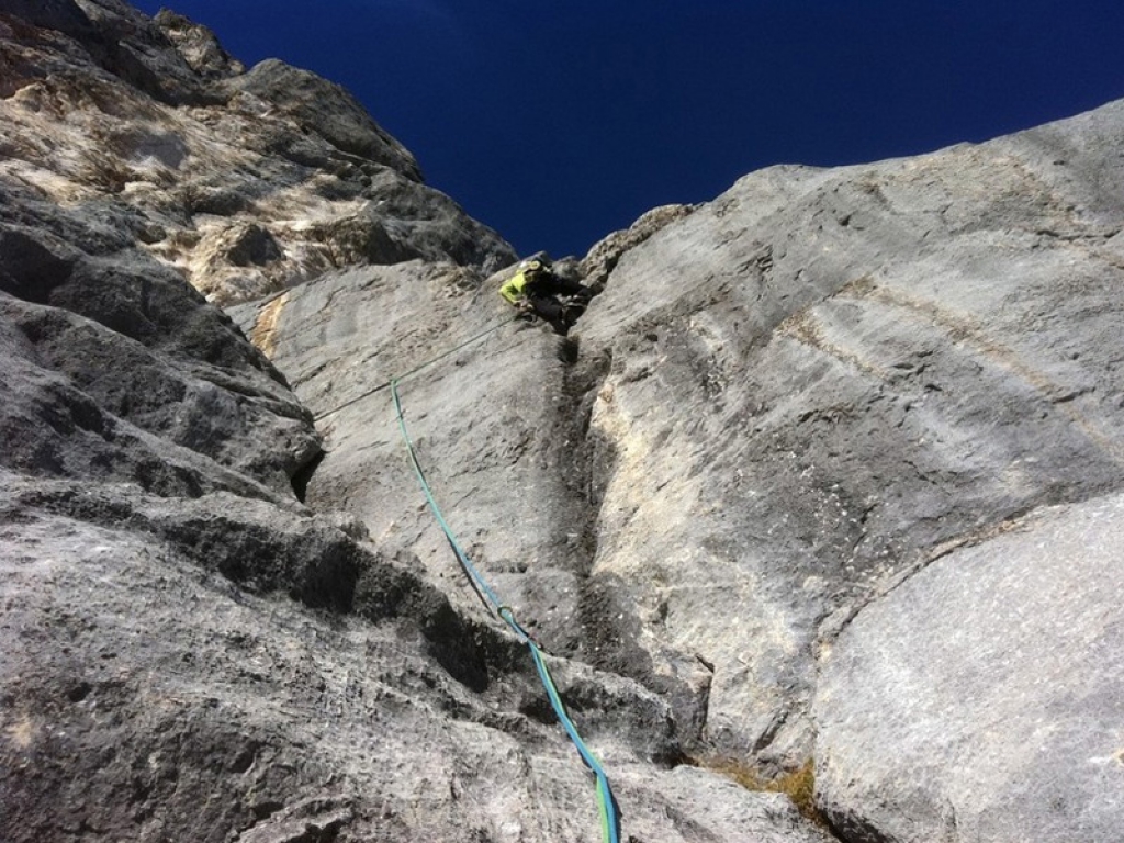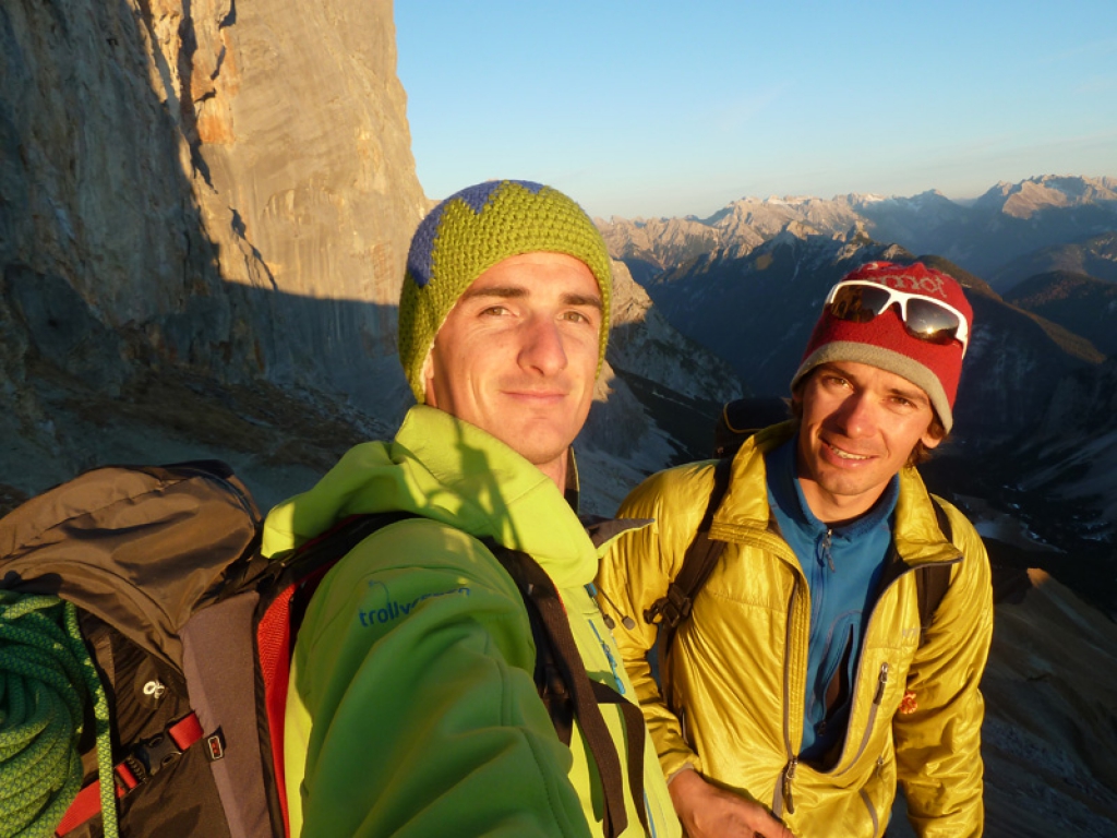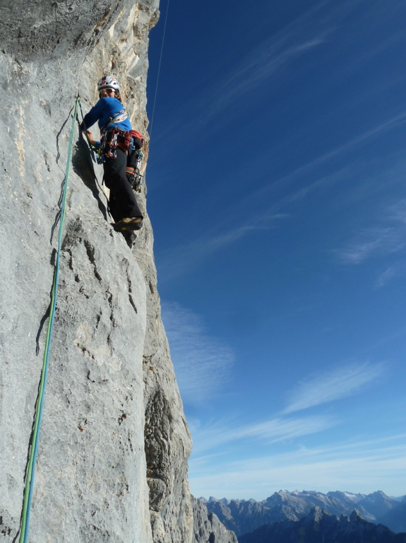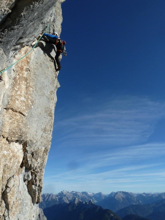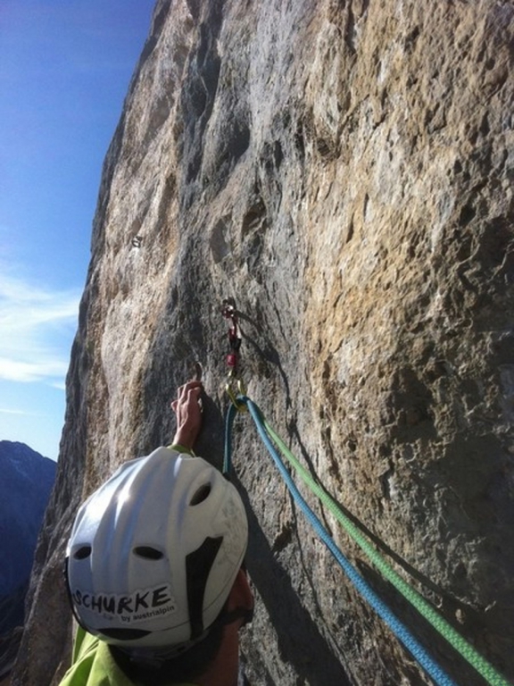 Endlich fand sich ein Zeitfenster um wohl das letzte große Projekt der heurigen Alpinkletter-Saison abzuhaken! Benni und ich starteten zeitig um einen neuerlichen Traumtag (ungefähr der 40. wolkenlose Tag in Serie!) an der Schüsselkarspitze zu nutzen. Während dem langen Zustieg entschied eine Runde Schere-Stein-Papier (a.k.a. „Schnick, Schnack, Schnuck“) darüber wer beginnen darf und somit die berühmte Piazschuppe in der 5. Seillänge erwischt… Meine Schere hat leider verloren… egal, dafür gehörte mir die 8er Länge in der 8ten Seillänge!