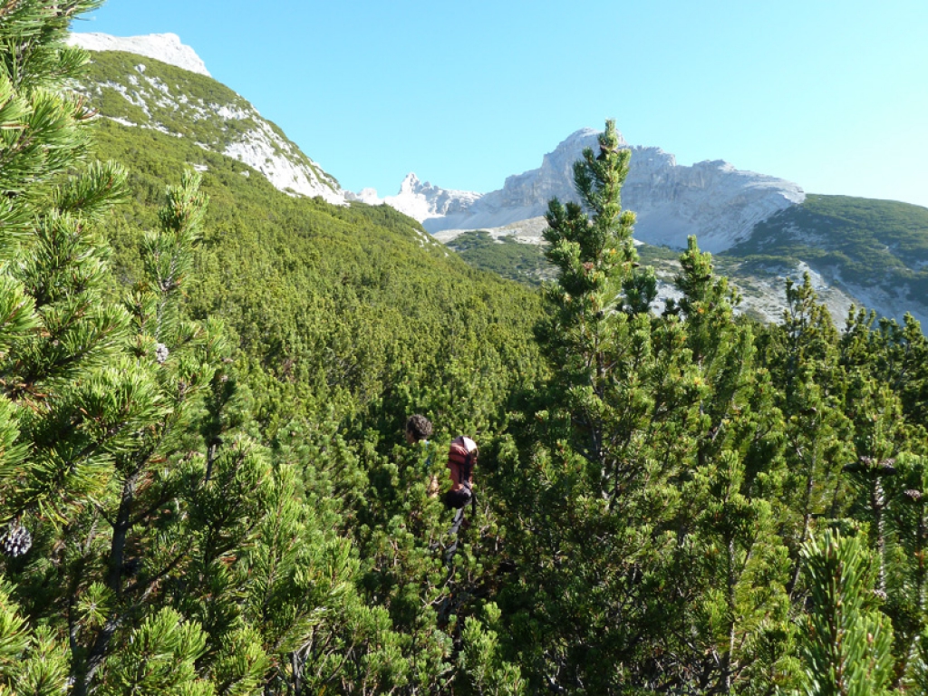 Um noch „unerforschtes“ Gebiet besichtigen zu können wählten wir als Zustieg einen, auf der ÖK eingezeichneten, Jägersteig, der vom Kienleitensattel direkt ins Mitterkar führt. Großer Fehler. Auf ungefähr halbem Weg stellte sich entgültig eraus, dass dieser Steig schon seit Jahren nicht mehr verwendet wird, aber zu diesem Zeitpunkt standen wir schon mitten in meterhohen Latschen… Nützt nichts – es folgte Latschenkletterei des höchsten Schwierigkeitsgrades!