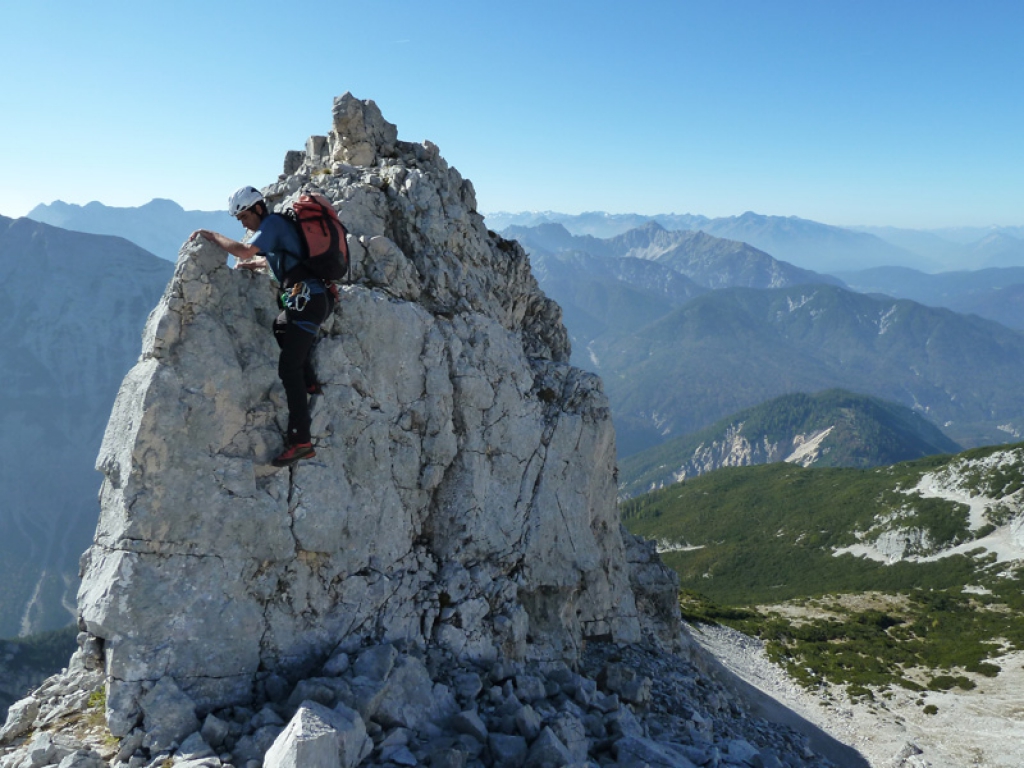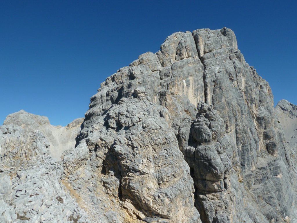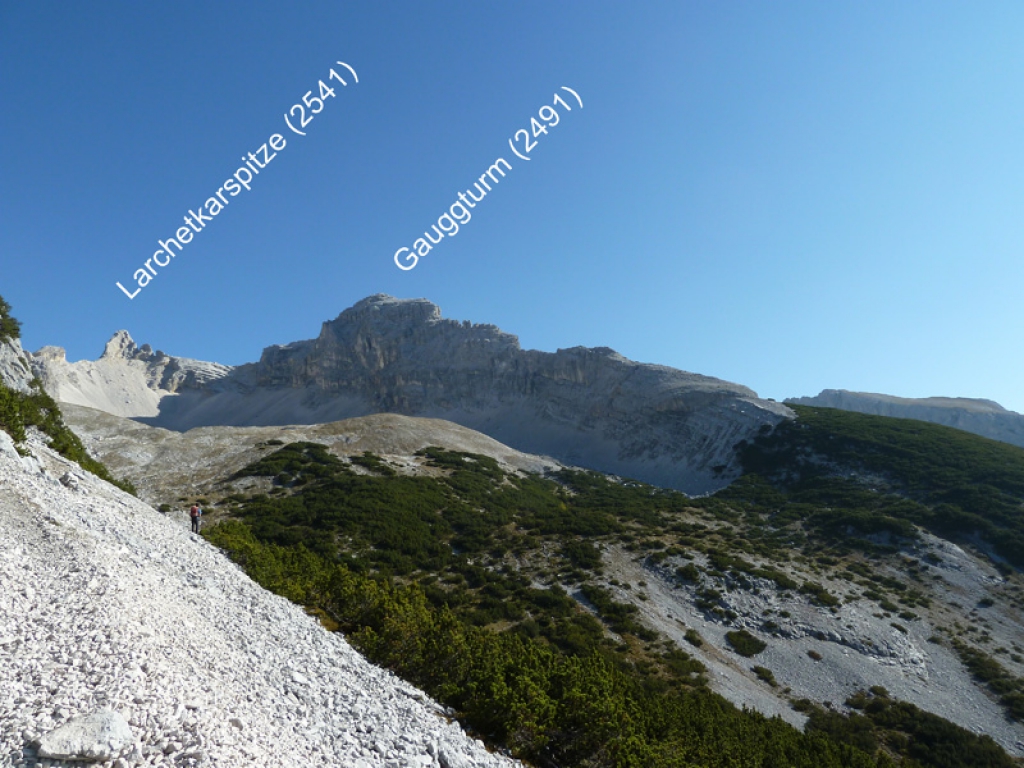 Der weitere Gratverlauf bis zum Gauggturm ist stellenweise ziemlich brüchig (soll heißen: noch brüchiger, als man im Karwendel ohnehin erwartet) und fordert stellenweise Kletterei im 4. Grad.