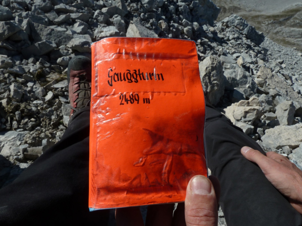 Das Gipfelbuch am Gauggturm bestätigte unsere Vermutung, dass dieser Gipfel selten überlaufen ist: Ca 20 Seilschaften seit 1979…