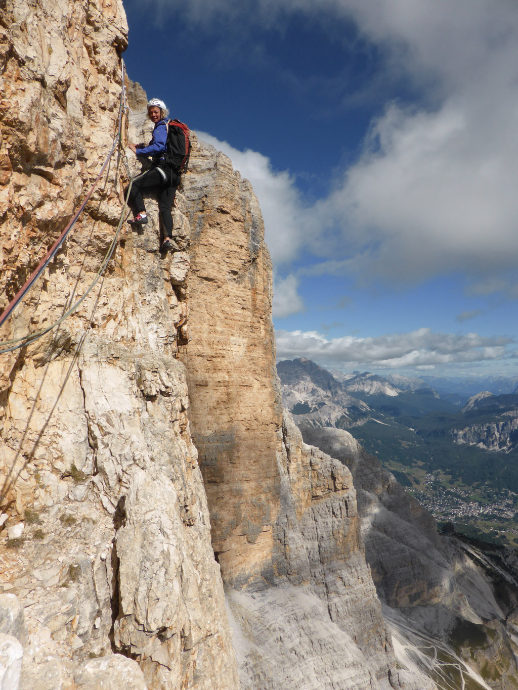 Heute stand ein ganz besonderer „Familienausflug“ am Programm: gemeinsam mit meinen Eltern kletterten Claudia, Lucky und ich durch die landschaftlich beeindruckende Südwand der Tofana. Meist bewegt man sich im 4. Schwierigkeitsgrad, mit der einen oder anderen Passage im Gehgelände. Die Schüssellänge im riesigen Amphitheater verblüfft durch ihre Steilheit, ebenso wie die äußerst exponierten Quergänge davor und danach! Apropos Schlüssellänge: Hier gibt es zwei Möglichkeiten. Meine Eltern entschieden sich für die knackige (weil steilere) linke Variante über einen kleinen Überhang. Lucky führte uns über etwas leichteres Gelände in einem Zick-Zack über eine Rampe, zuerst nach rechts, und dann zurück zum nächsten Standplatz am Beginn der Rissverschneidung. Die restliche Routenfindung ist relativ unproblematisch – man folgt immer konsequent der einfachsten Linie.