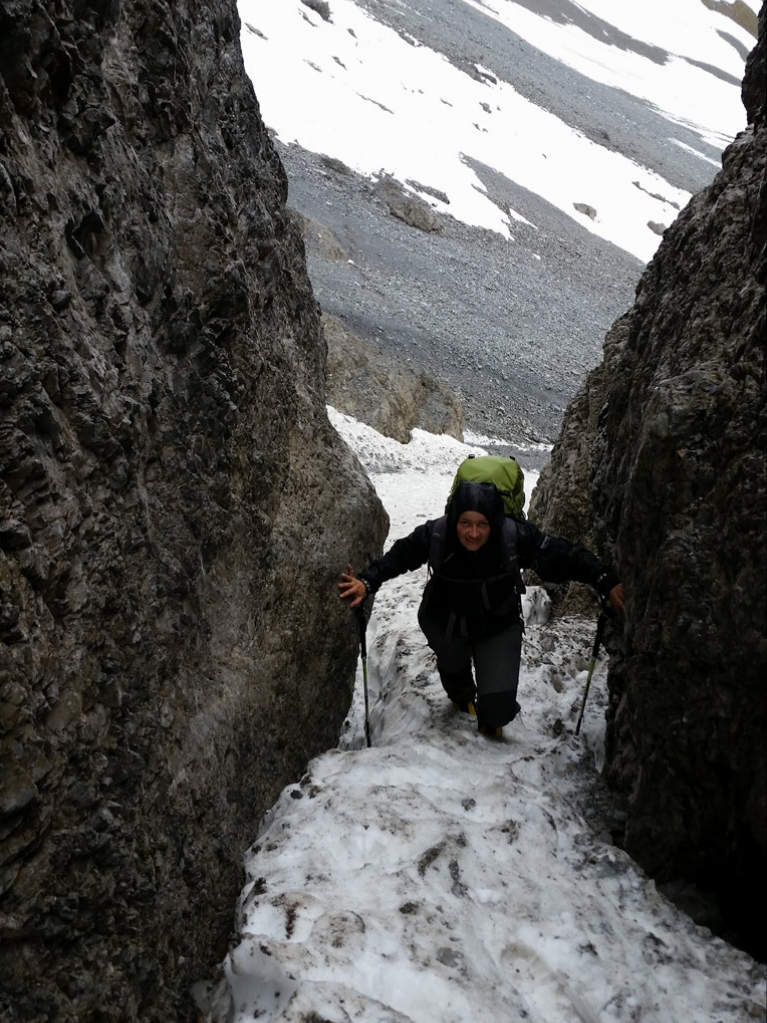 Wie bei unserer letzten Begehung der Route 2013 waren wir auch heuer wieder erstaunt über die anspruchsvolle Kletterei in dieser klassischen Kalkkögel-Route! Diesmal hat uns zumindest der Zustieg keine Probleme gemacht weil es noch genug Schnee in der schmalen Schlucht gab. Dafür kämpften wir gegen kalte Finger da es am Start der Route in Strömen regnete. Zur Urlaubsvorbereitung kletterten wir diesmal beide mit unseren schweren Berschuhen, was aber bei Nässe gar kein großer Nachteil ist.