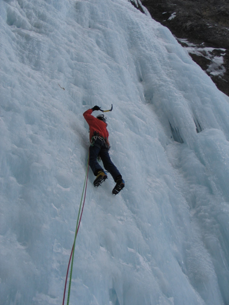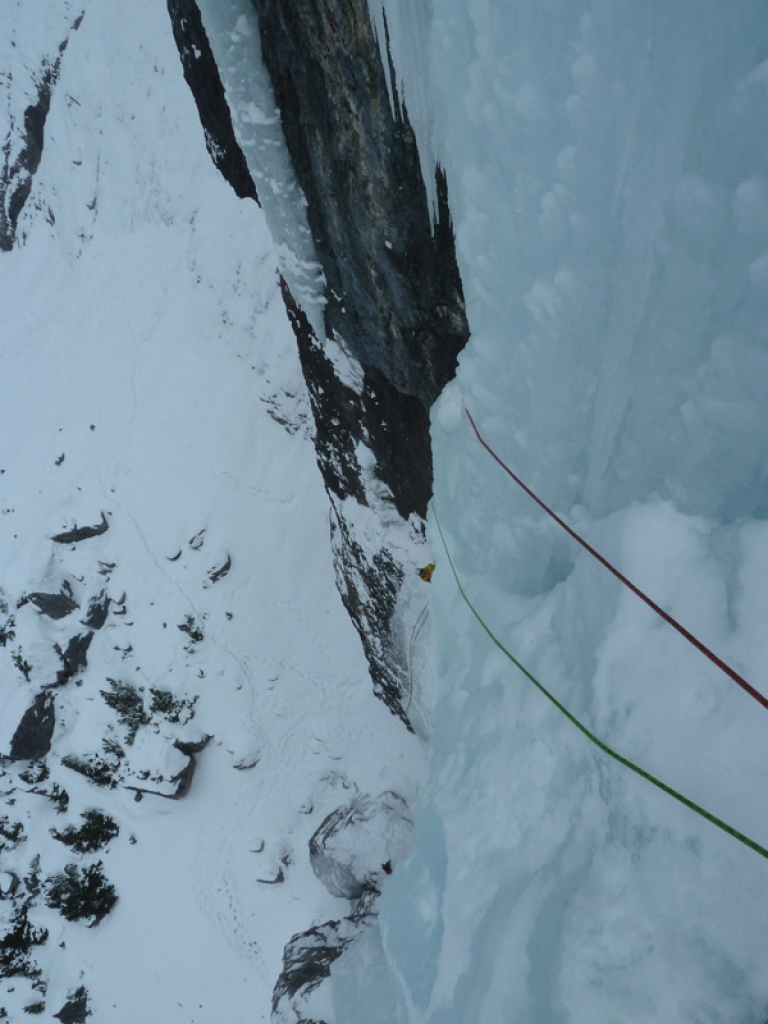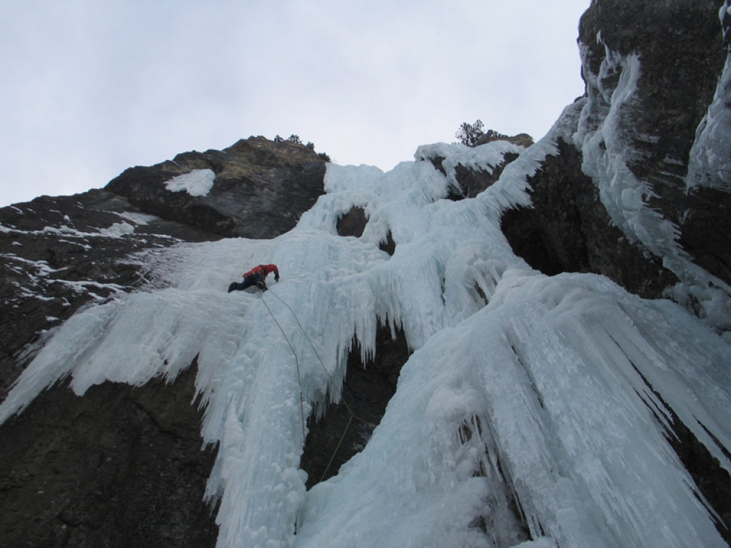 Als ersten Eisfall des Tages wählten wir den Vorhang (WI 5-), den wir beide in einer Seillänge im Vorstieg kletterten. Am Ende der Schwierigkeiten fand sich dankenswerter Weise eine perfekte Eissanduhr mit Umlenkkarabiner und auch in der zentralen Linie sparten einem zwei Abalakovs die Kraft selbst Schrauben zu setzen.