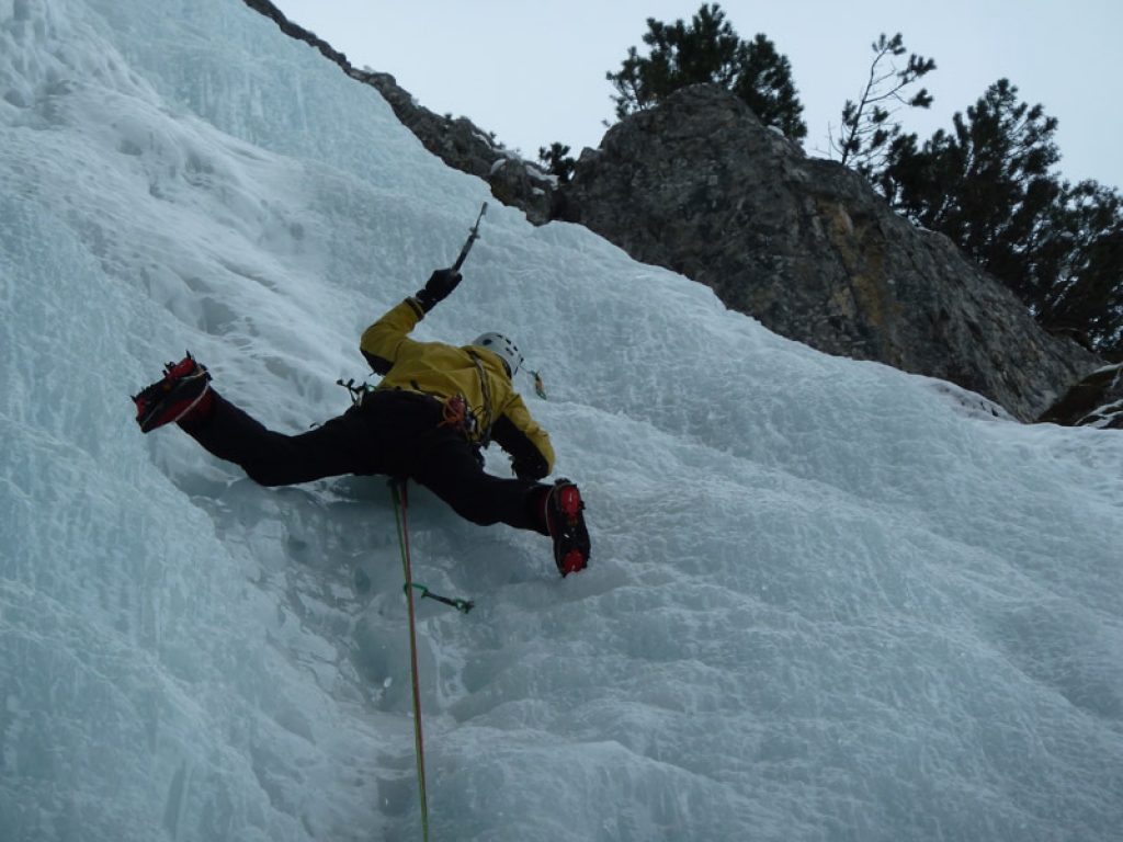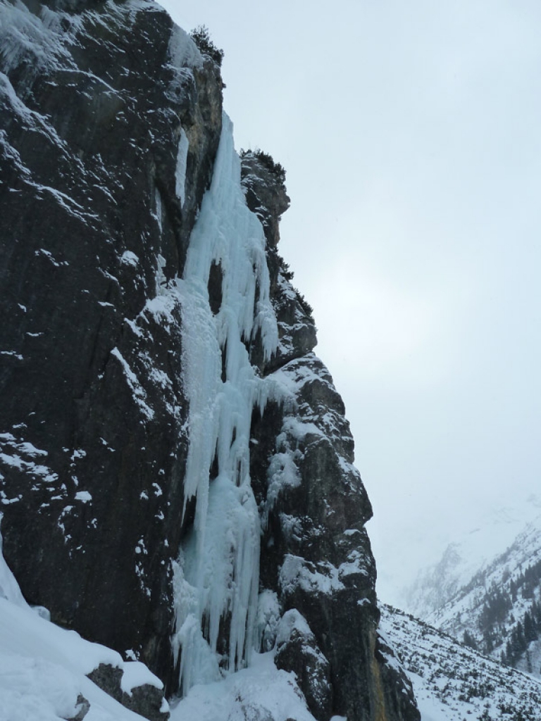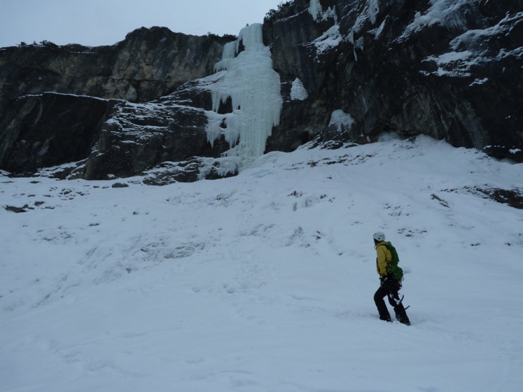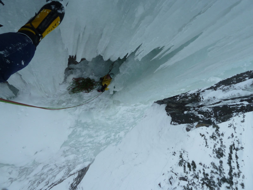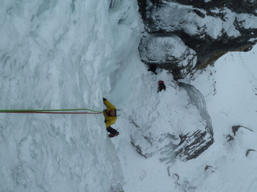 Zum Abschluss statteten wir der Eiszeit (WI 5-) einen kurzen Besuch ab. Die erste Seillänge ist um einiges steiler, als man von unten vielleicht annehmen möchte, aber die zahlreichen Begehungen erleichterten auch hier das Klettern. In der kurzen zweiten Seillänge wird’s dann richtig senkrecht, aber auch hier ist die Eisqualität perfekt.