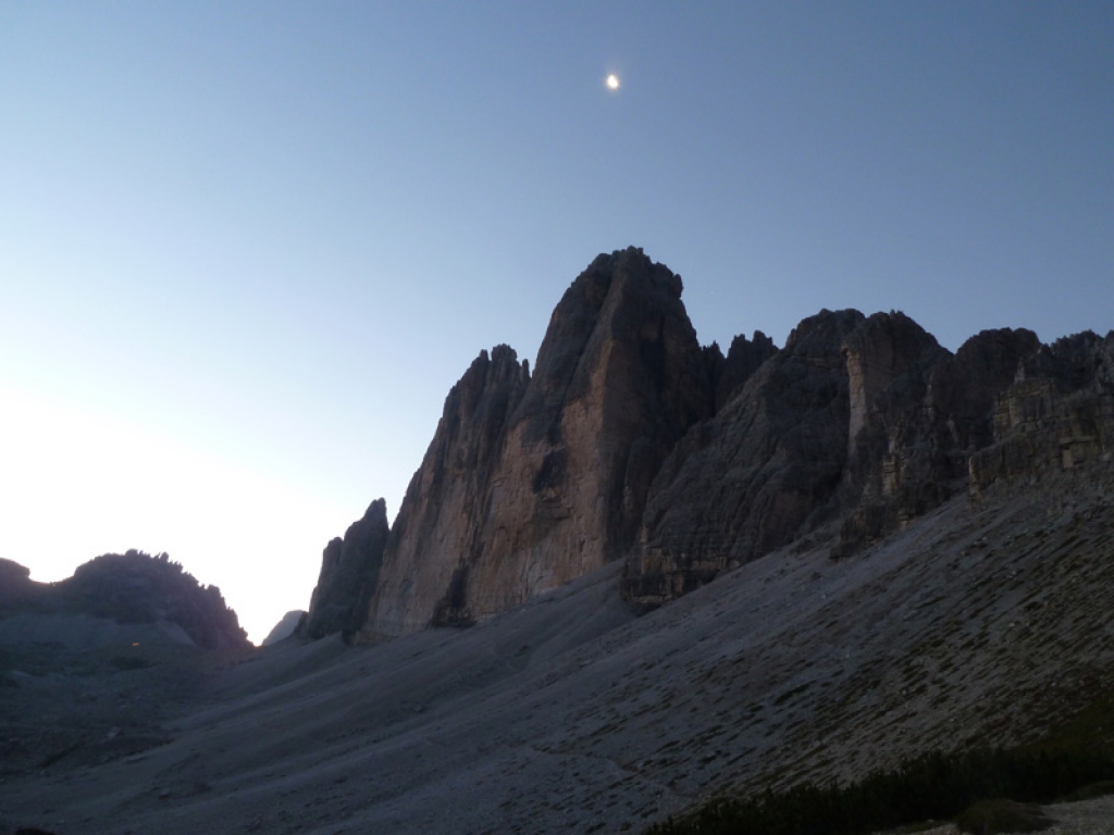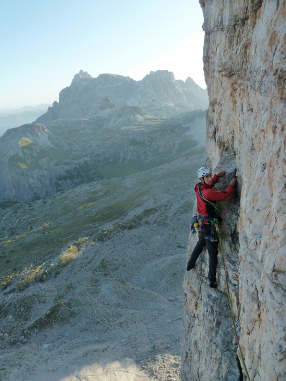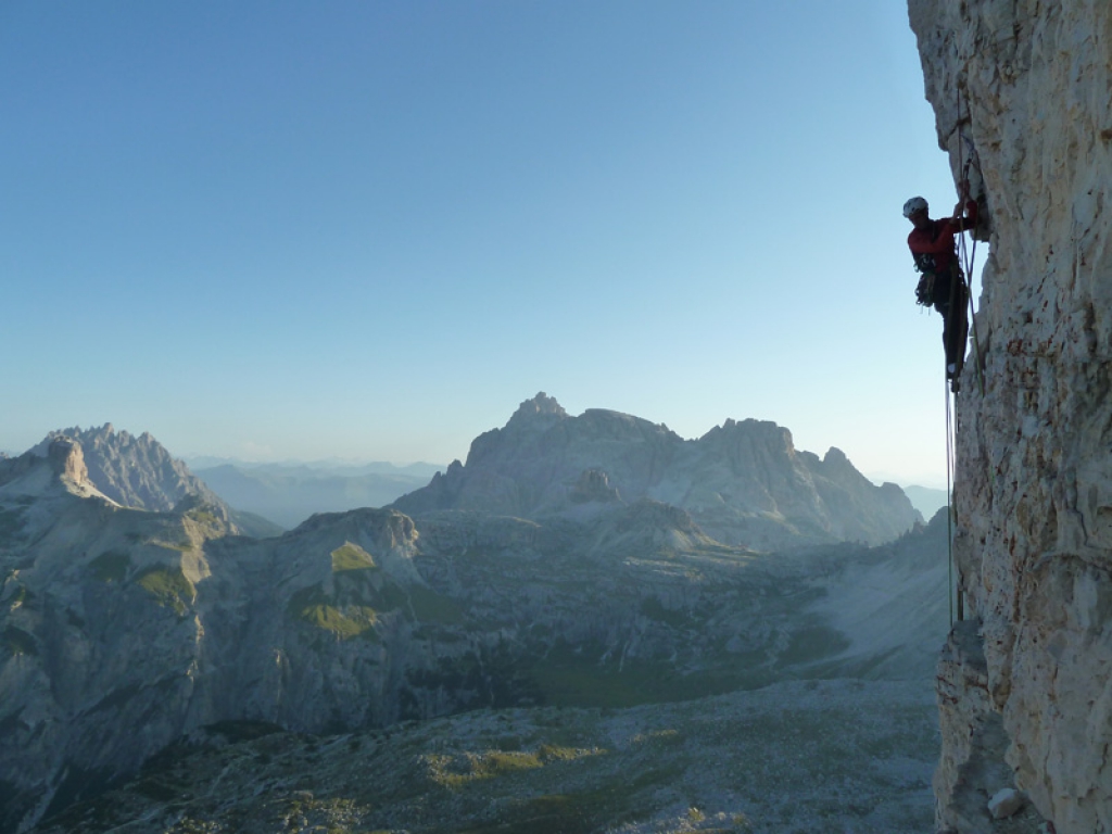 Mein Vater und ich nutzten die hohen Temperaturen der letzten Tagen und kletterten an der Schattenseite der Drei Zinnen. Früh aufstehen lohnt sich, denn in berühmten Routen wie der „Cassin“ ist man bei diesem Prachtwetter selten alleine. Keine Minute zu früh schlüpften wir gegen 6:30 am Einstieg als erste Seilschaft in die Kletterschuhe, ehe schon die nächsten 4 Teams im Anmarsch waren…