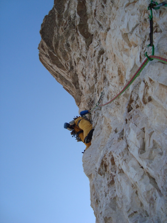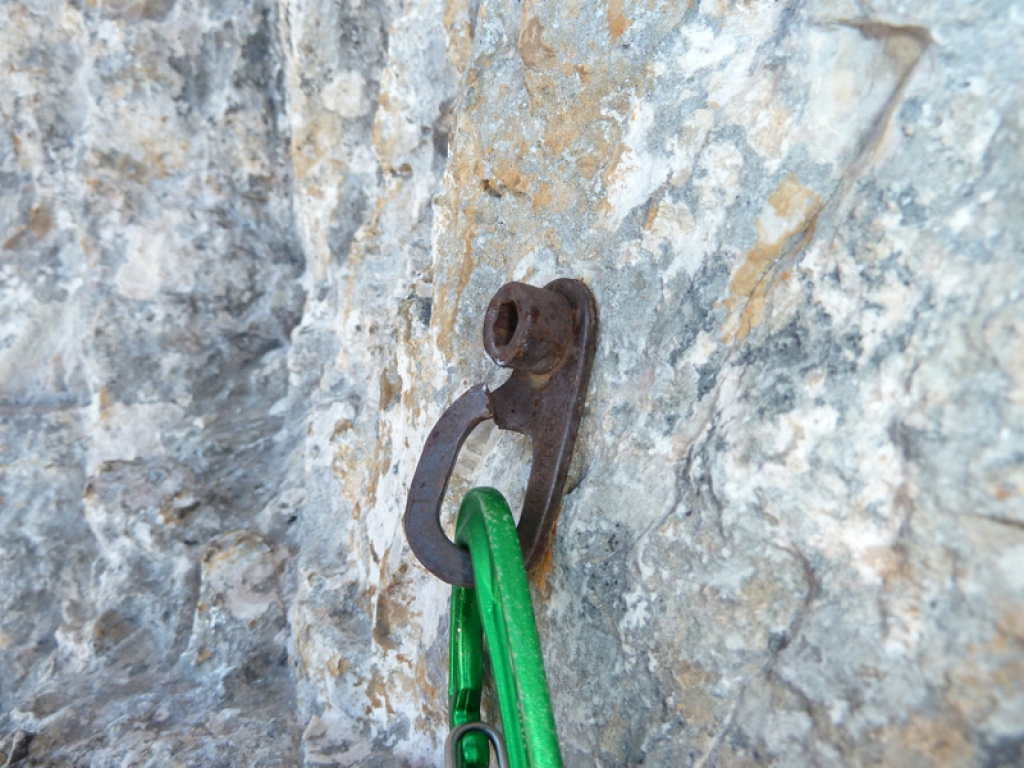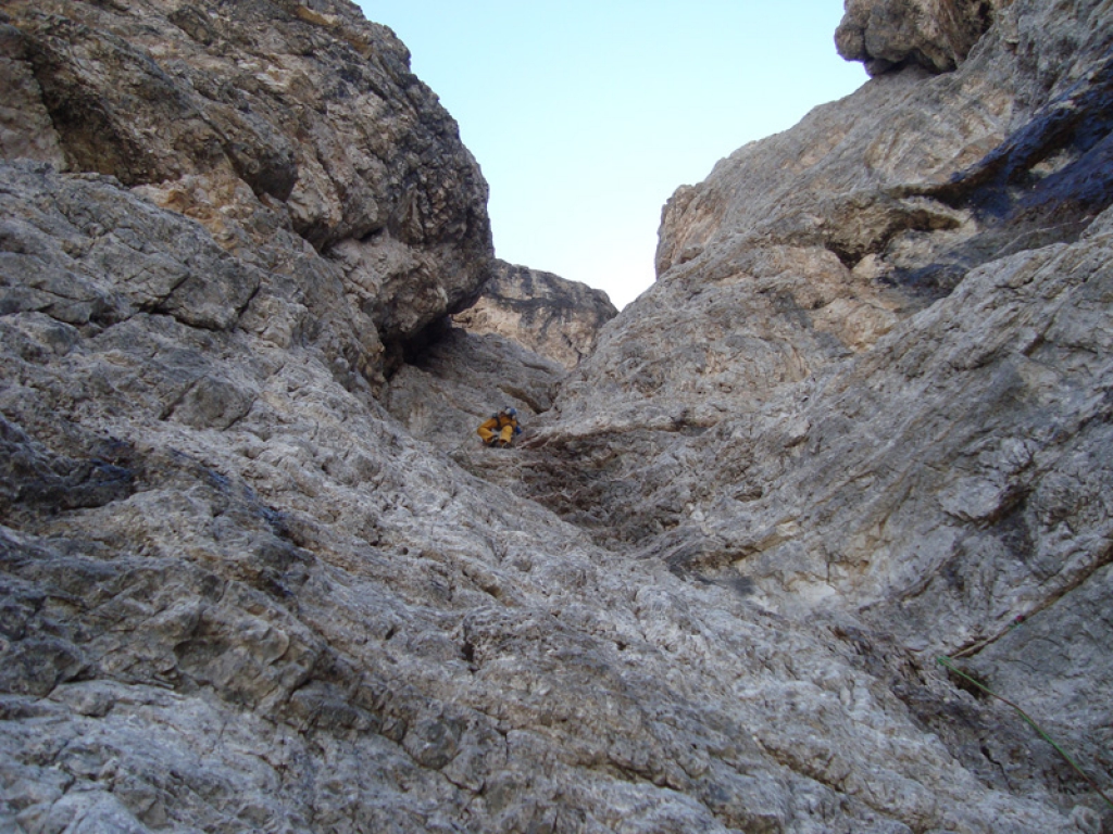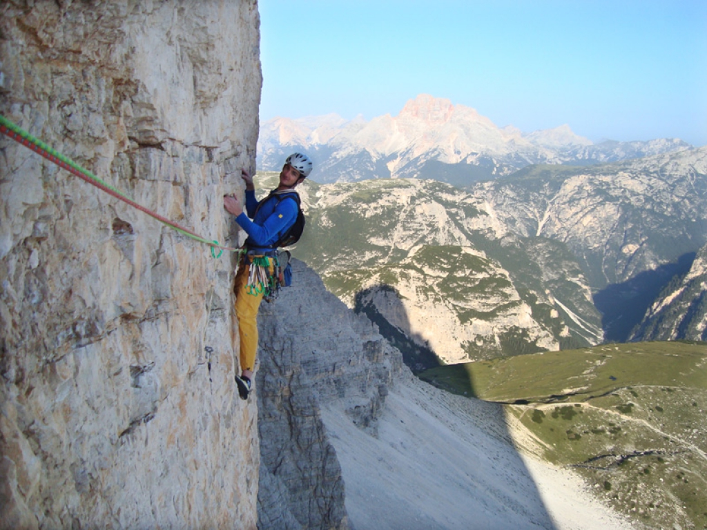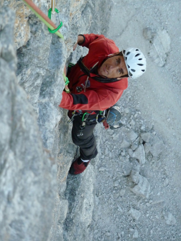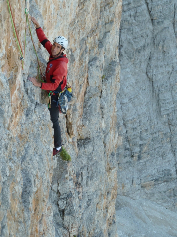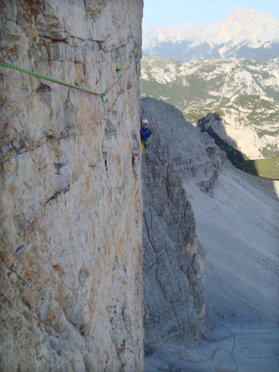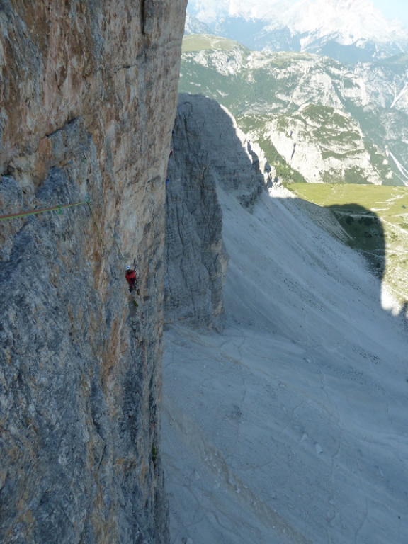 Bereits ab der zweiten Länge wird die Route ziemlich steil und ausgesetzt – ein kleiner Vorgeschmack auf das, was der Quergang bietet. Da wir immer wieder Seillängen zusammenhängten standen wir schon nach der dritten Länge am bequemen Standplatz an der Abzweigung der „Via Scoiattoli“, welche die beeindruckende Kante senkrecht empor zieht. Hier beginnt der Quergang, sehr exponiert, aber anfangs noch recht beschaulich, was die Schwierigkeit betrifft.