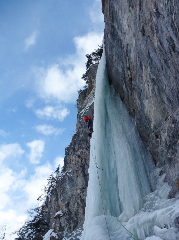 Der Zustieg ist wegen dem hüfttiefem Schnee nicht gerade einfach, aber man sollte das schöne Eisschild einmal geklettert sein. In den ersten 15 m war das Eis sehr dünn, was meine Klingen büßen mussten, aber nach oben hin wird’s dann immer besser und steiler. Am Ausstieg stecken zwei Normalhaken, die wir mit einer neuen Reepschnur ausstatteten. Kettenglied und Schnappkarabiner garantieren ein unbeschwertes Abseilen.