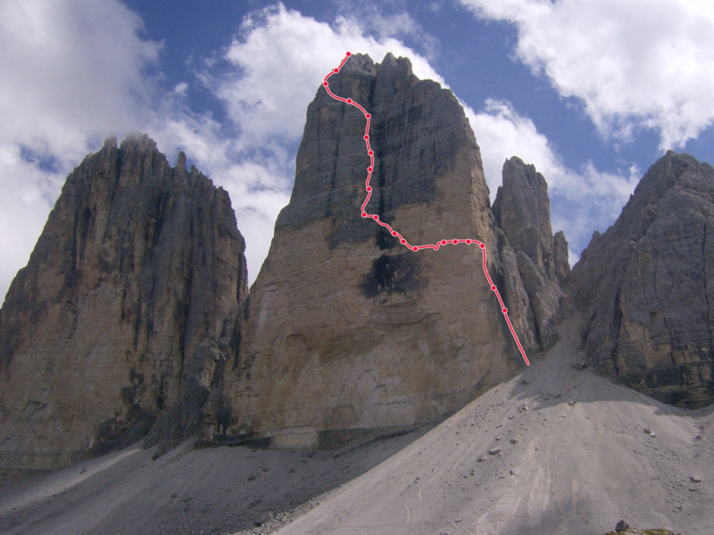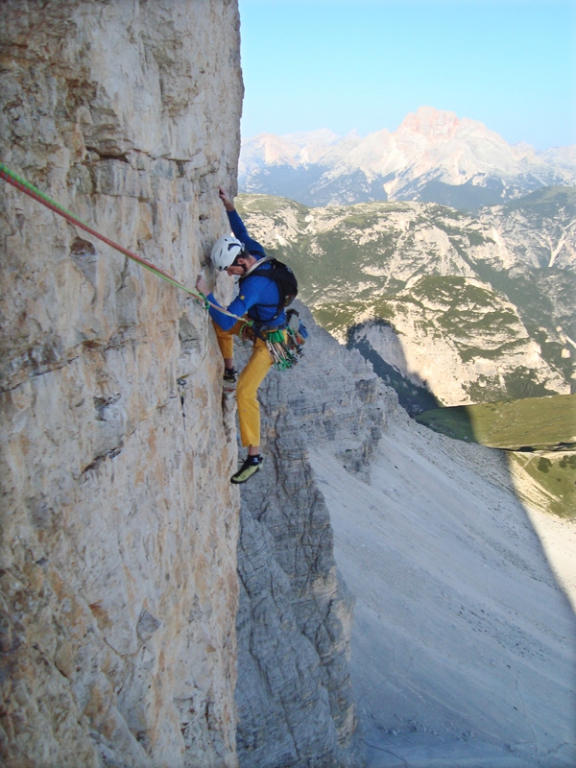 Mein Vater und ich nutzten die hohen Temperaturen der letzten Tagen und kletterten an der Schattenseite der Drei Zinnen. Früh aufstehen lohnt sich, denn in berühmten Routen wie der „Cassin“ ist man bei diesem Prachtwetter selten alleine. Keine Minute zu früh schlüpften wir gegen 6:30 am Einstieg als erste Seilschaft in die Kletterschuhe, ehe schon die nächsten 4 Teams im Anmarsch waren…