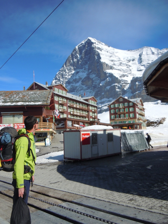 Nachdem wir die idealen Verhältnisse in der Wand Anfang Feber verschlafen hatten, hielten wir uns immer wieder ein paar Tage frei, in der Hoffnung auf eine zweite Chance noch vor dem Sommer. Denn eines war uns klar: wir wollten die Wand im Winter, oder zumindest bei noch winterlichen Verhältnissen durchsteigen, denn auf die großen objektiven Gefahren in den Sommermonaten (Steinschlag!) hatten wir beide keine Lust. Nachdem Benni die letzte Woche am Olymp und ich im Jamtal verbracht hatten war die Freude groß, dass der Wetterbericht für den 5. bis 8. April vielversprechend aussah… Am Dienstag (5. April 2011) packten wir unsere Sachen und fuhren nach Grindelwald. Mit einer der letzten Bahnen ging’s hinauf auf die Kleine Scheidegg und von dort zu Fuß weiter über die Piste zur Station Eigergletscher.